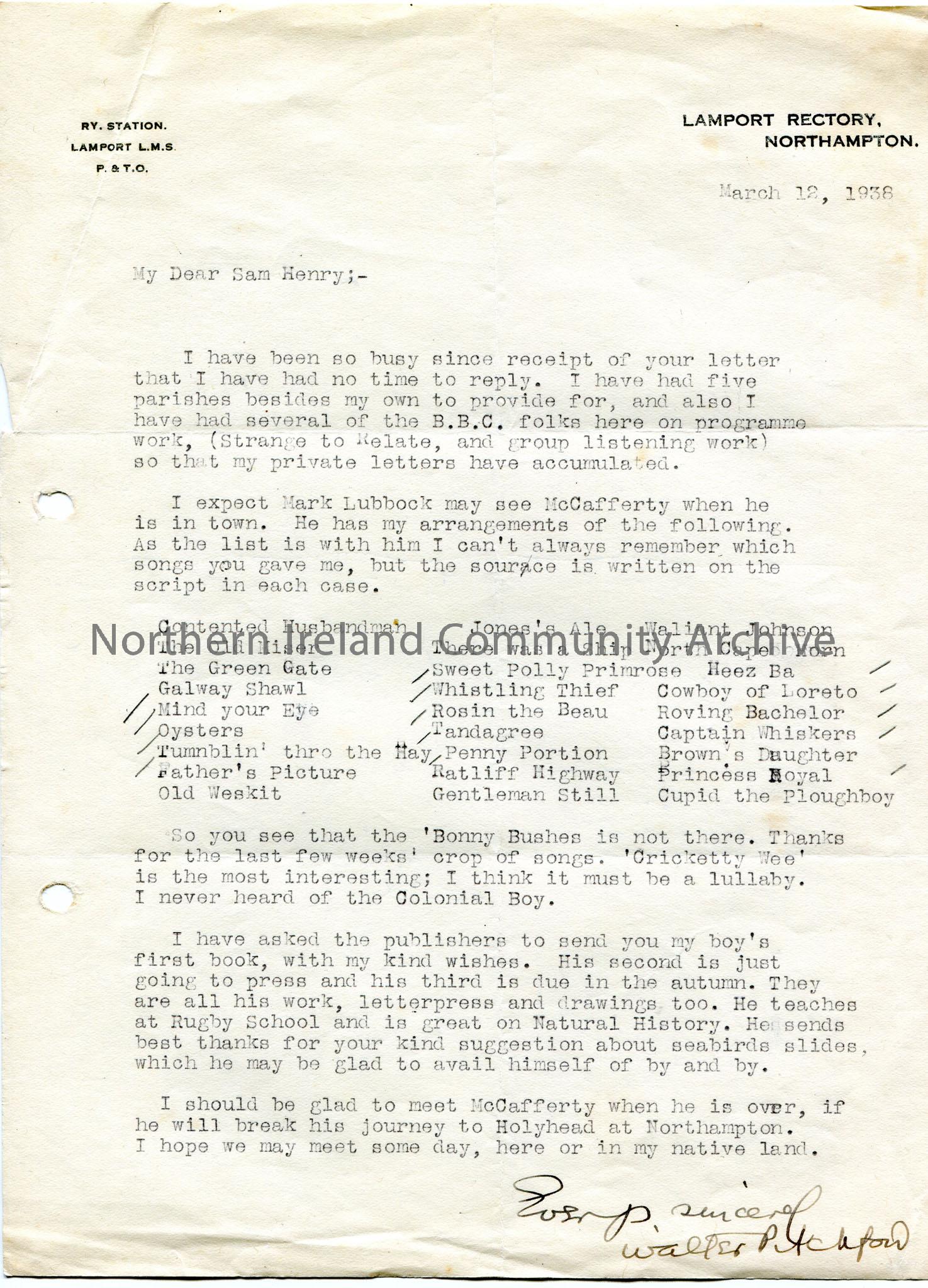 Typed letter to Sam Henry. He is late to reply due to a heavy workload with the parishes and the BBC. Provides list of several arrangements of songs. Mentions [James] McCafferty and Mark Lubbock. Will send Sam his son's first book who teaches at Rugby School and 'is great on Natural History'.