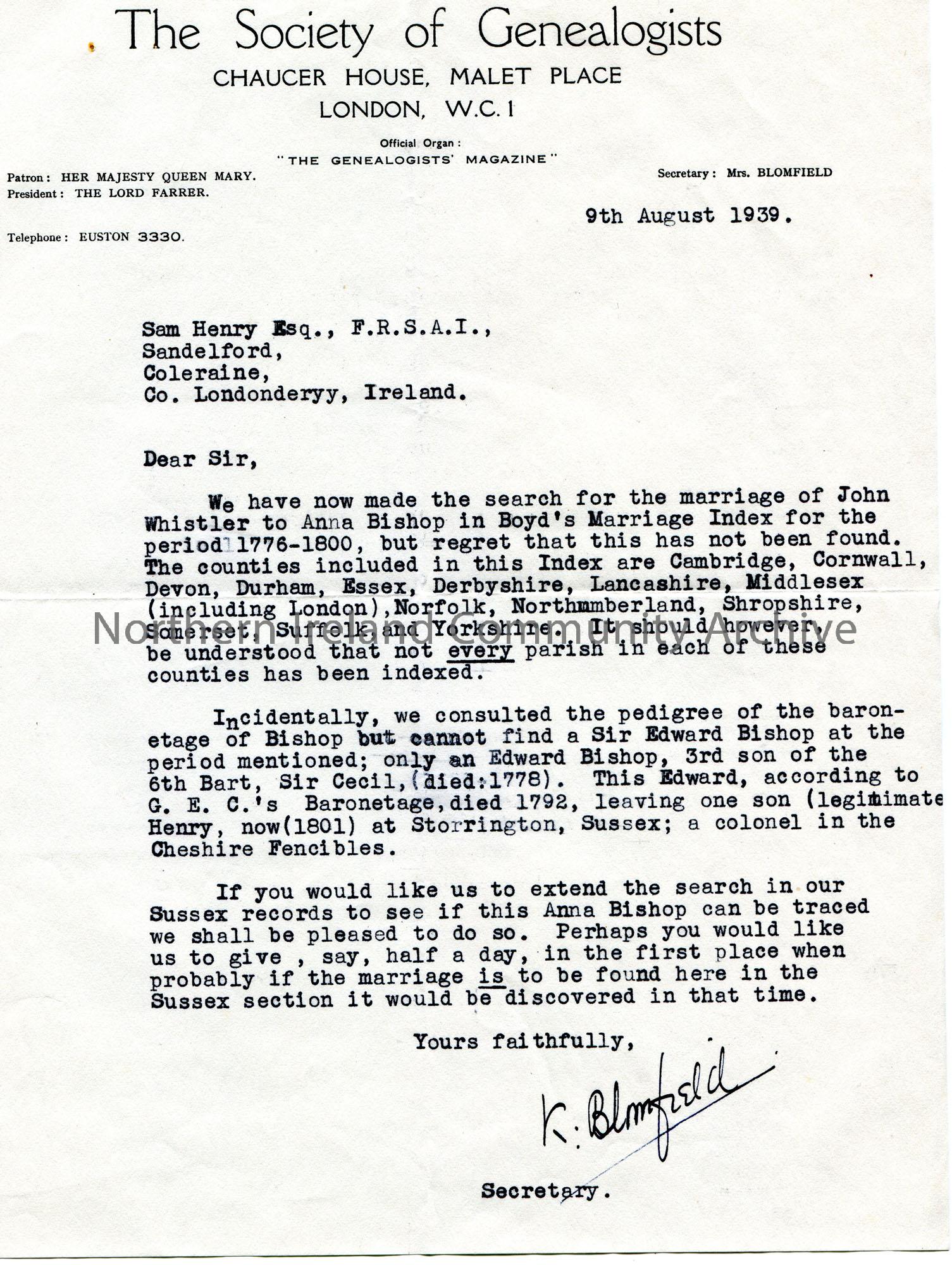 Typed letter to Sam Henry. Informs Sam that no information has been found re the marriage of John Whistler and Anna Bishop in Boyd’s Marriage Index, 1776-1800. Proposed an extended search in the Sussex records.