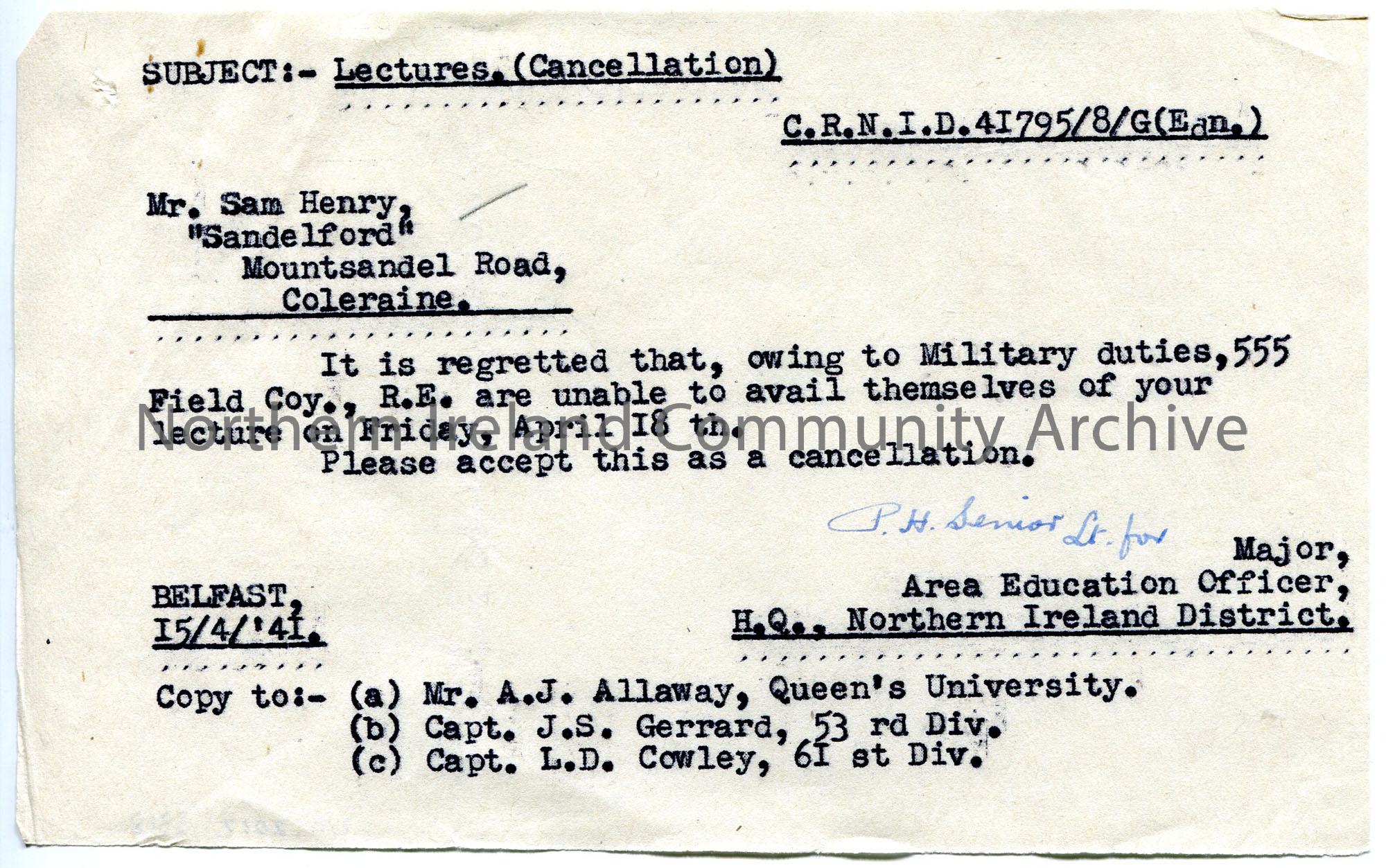 Typed letter to Sam Henry. Notice of cancellation for Sam’s lecture on 18th April to 555 Field Coy., R.E. Due to Military duties.