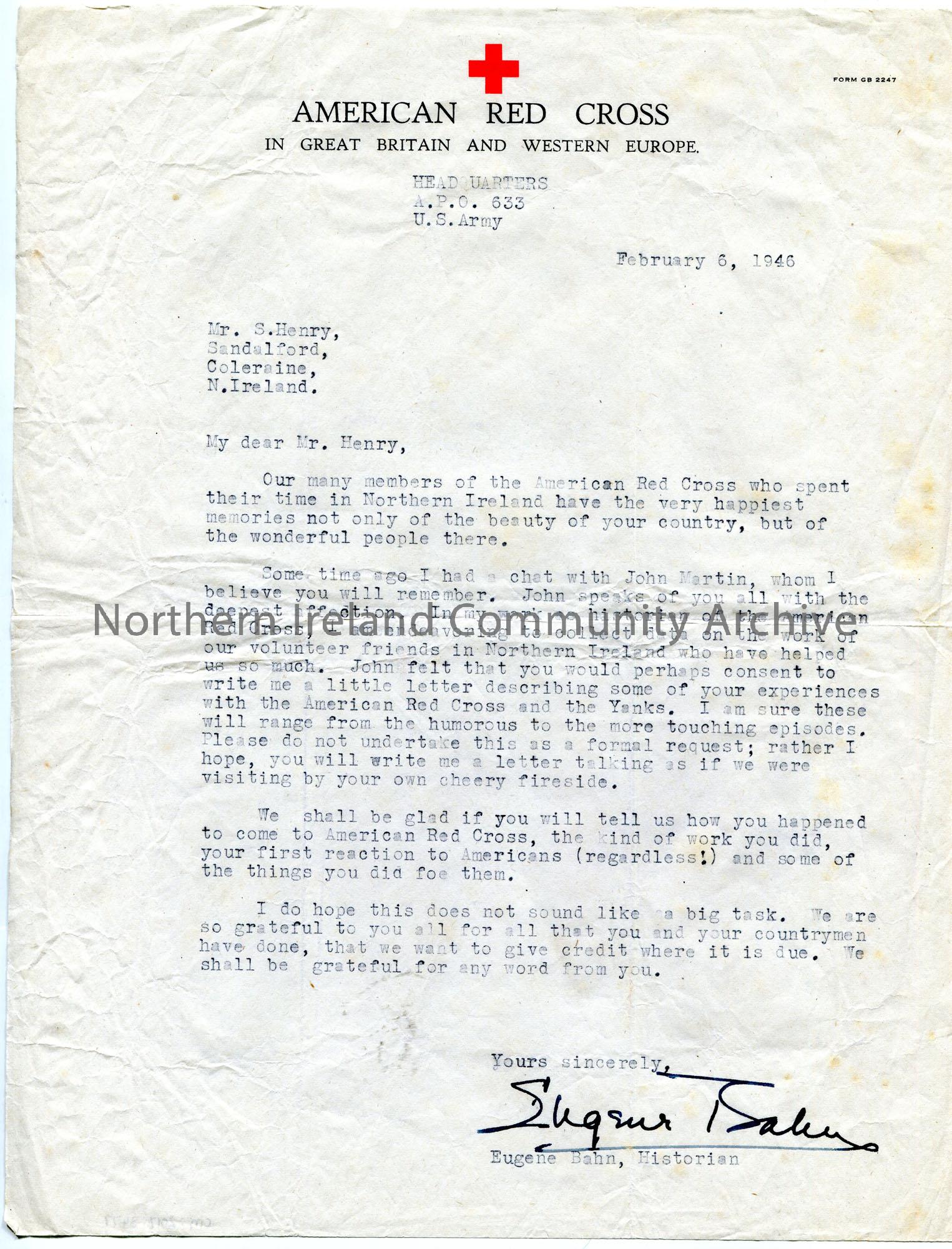 Typed letter to Sam Henry on headed paper. Asking Sam to respond with information on his experiences with the American Red Cross and the 'Yanks' whilst they were in Northern Ireland. Writes of talking with John Martin who 'speaks of you all with deepest affection'.