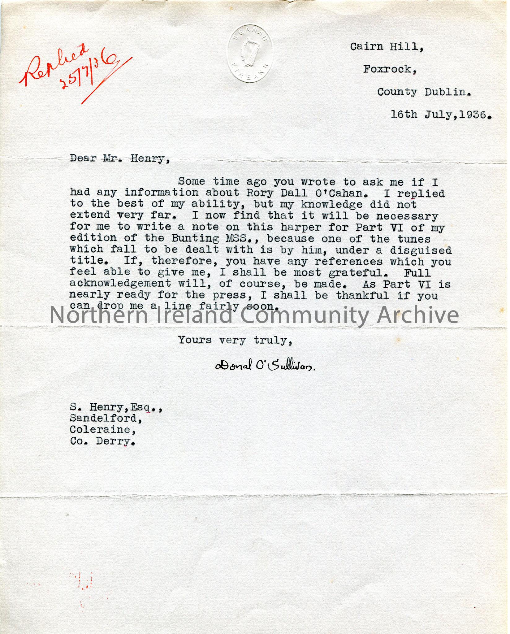 Typed letter to Sam Henry re information on Rory Dall O’Cahan, on Seanad Eireann [upper house of Irish Parliament] imprinted paper