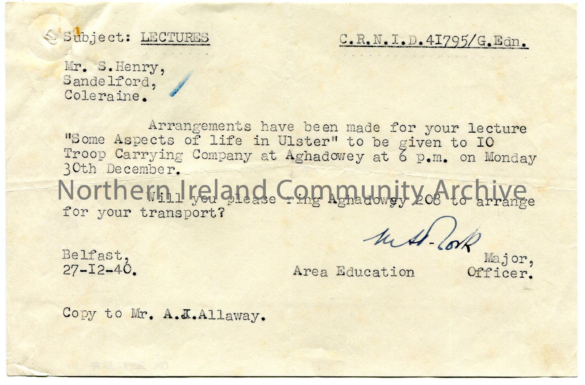 Typed letter to Sam Henry re lecture. Confirmation of arrangements for lecture to be given by Sam on 'Some Aspects of Life in Ulster'. Lecture to be given to 10 Troop Carrying Company at Aghadowey on 30th December. Sam to ring Aghadowey 208 to arrange transport.