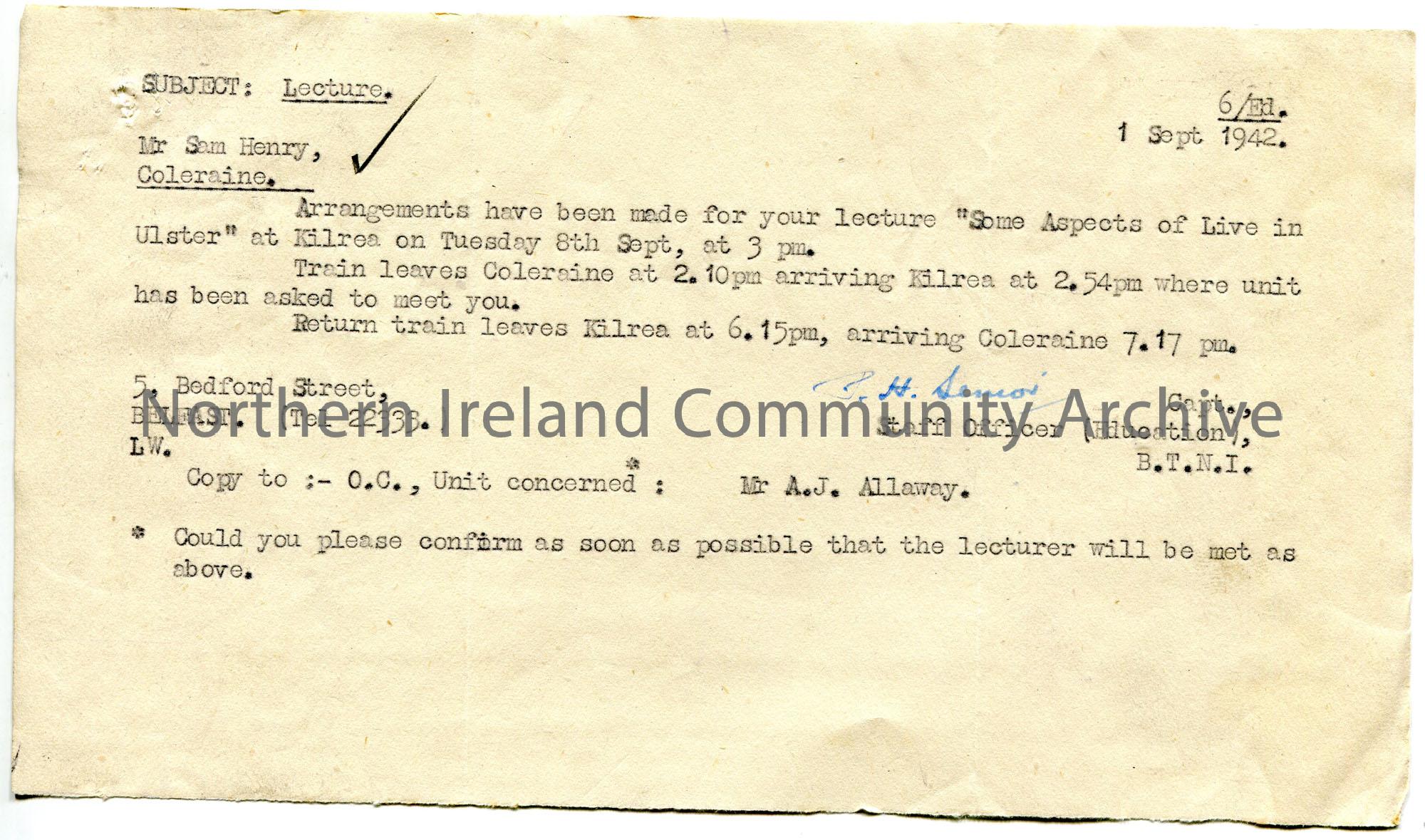 Typed letter to Sam Henry re lecture to troops. Confirmation of travel arrangements by train to Kilrea on 8th September 1942 for lecture titled, 'Some Aspects of Life in Ulster'.