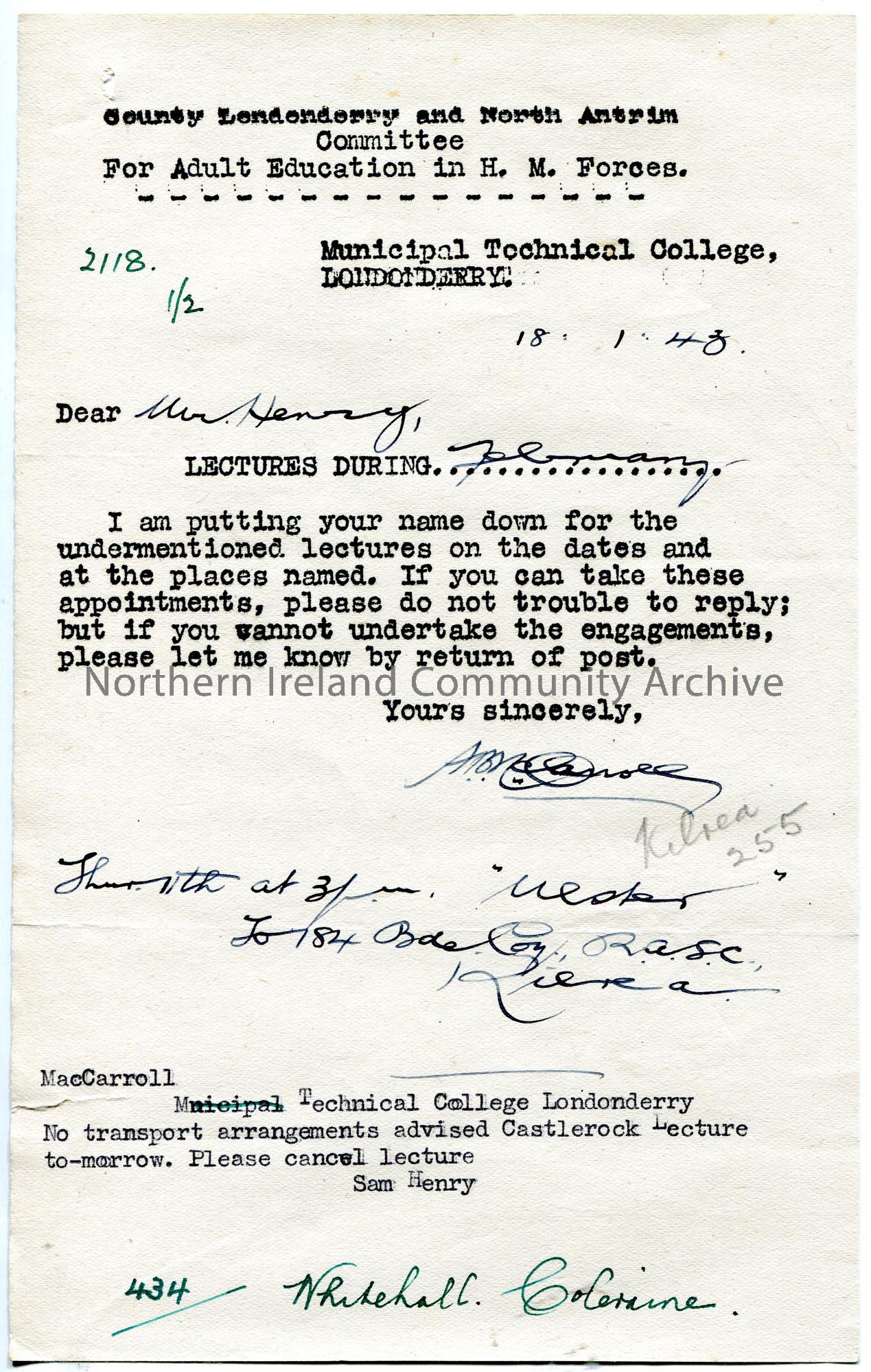 Typed letter to Sam Henry re lecture to troops. Proposes a lecture for Thursday 11th February 1943 on 'Ulster' to 184 Bde, Coy., R.A.S.C., in Kilrea. Typed note on bottom of letter advising a lecture in Castlerock to be cancelled as transport arrangements were not given. Mentions Whitehall, Coleraine.