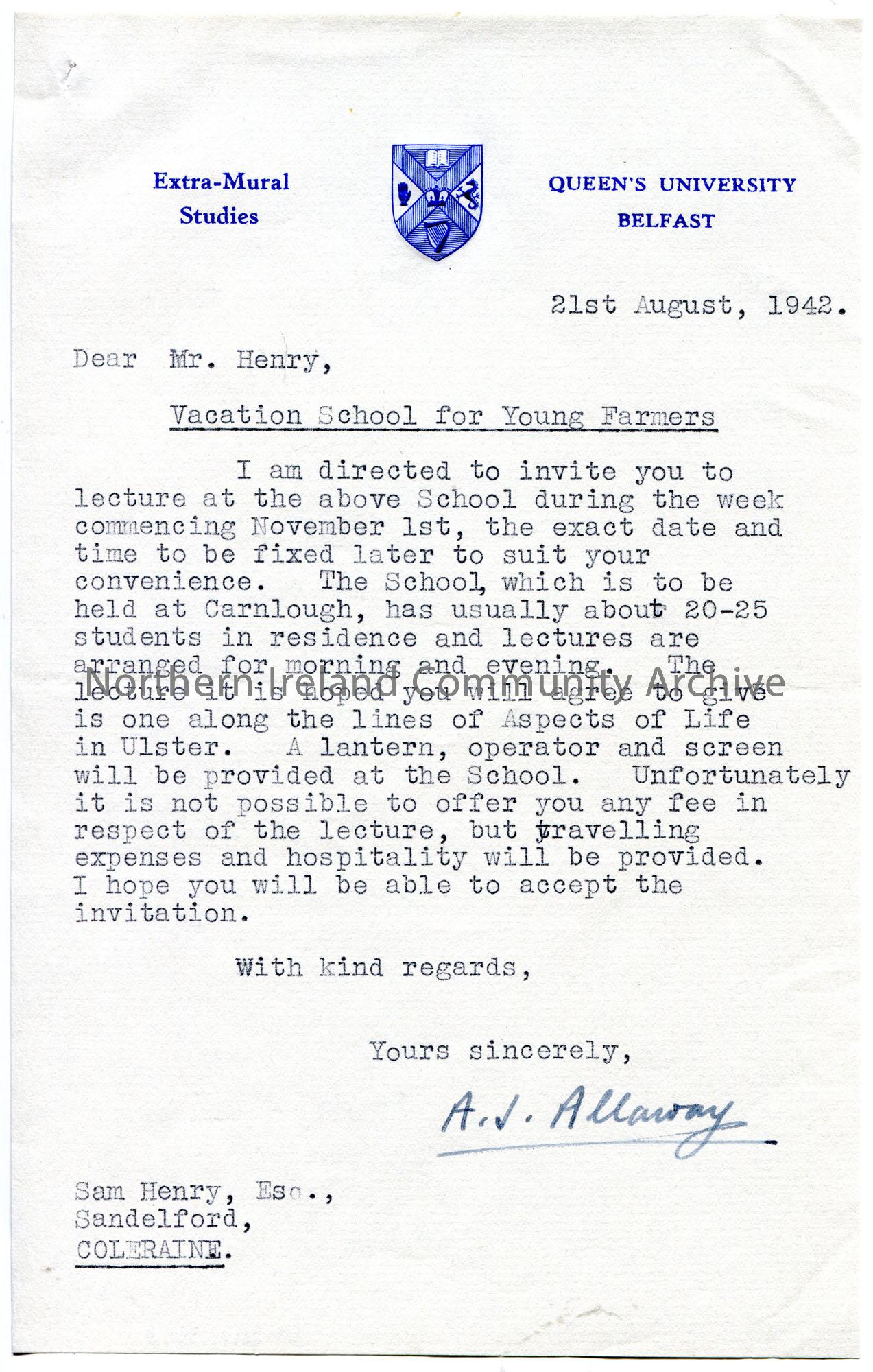 Typed letter to Sam Henry re lectures. Asking Sam if he wishes to lecture at ‘Vacation School for Young Farmers’ on ‘Some Aspects of Life in Ulster’ o…