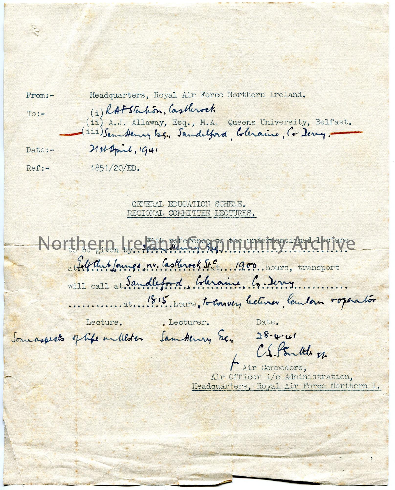 Typed letter to Sam Henry re lectures. Details of a lecture titled, 'Some Aspects of Life in Ulster' by Sam, to be held at the Golf Club Lounge, Castlerock at 7pm. A car will collect Sam and the lantern operator at Sandelford, Coleraine at 6.15pm.