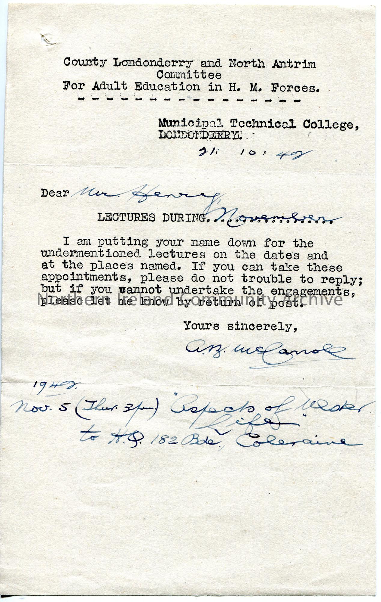 Typed letter to Sam Henry re lectures. Sam to confirm if he can carry out a lecture on 5th November 1942 on 'Aspects of Life in Ulster' to H.Q. 182 Bde., in Coleraine.