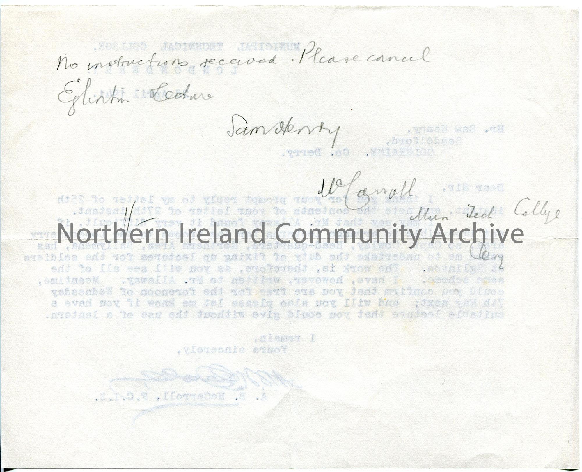 Typed letter to Sam Henry re lectures. Thanks Sam for his reply. Informing Sam that they will now arrange lectures for Sam in the Londonderry area, Eglinton, to troops as requested by Captain Cowley, Head-quarters, Northern Area, Ballymena. Mr Allaway found it difficult to do so. Handwritten note in pencil on back of page reads 'No instructions received. Please cancel Eglinton lecture. Sam Henry'.