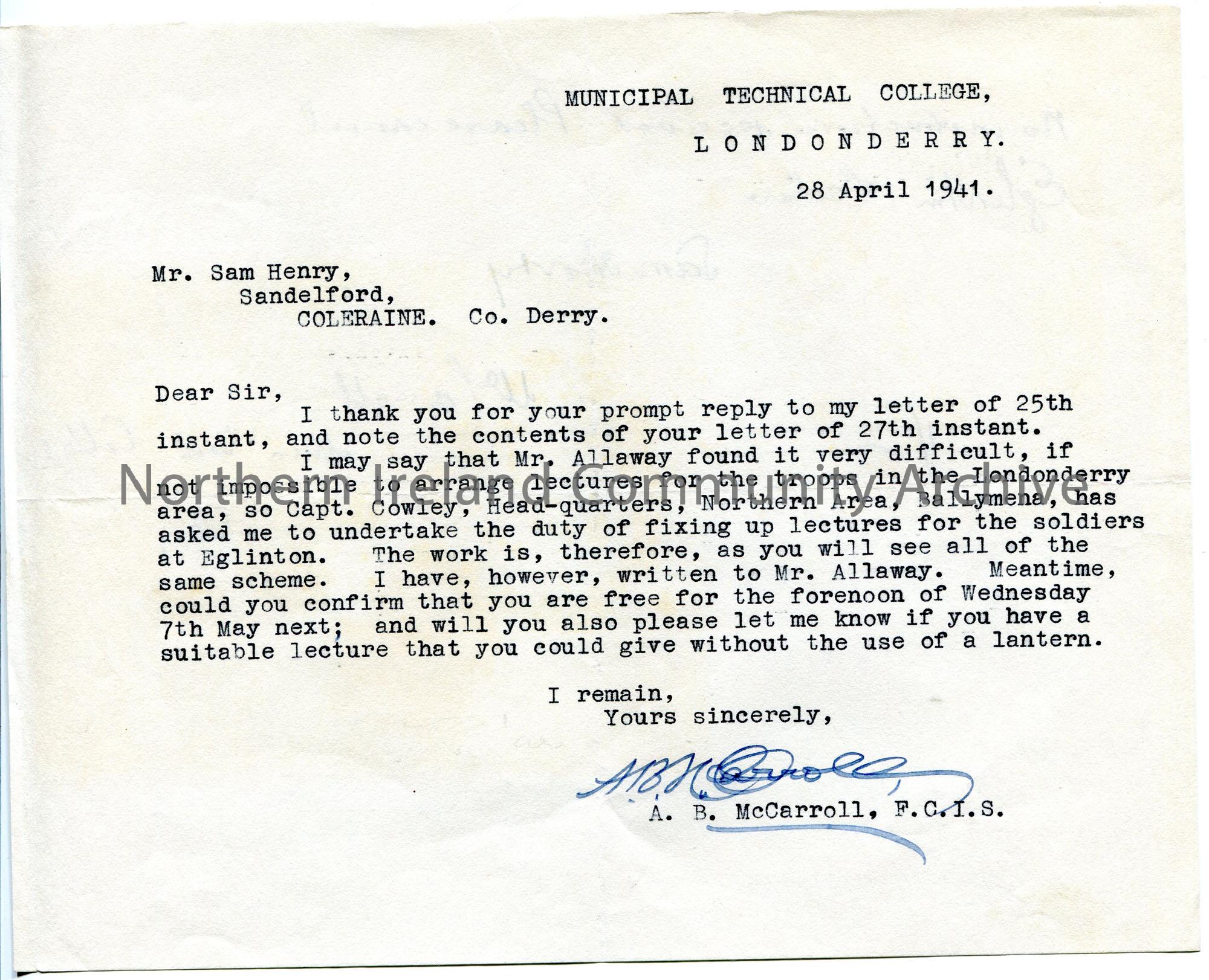 Typed letter to Sam Henry re lectures. Thanks Sam for his reply. Informing Sam that they will now arrange lectures for Sam in the Londonderry area, Eglinton, to troops as requested by Captain Cowley, Head-quarters, Northern Area, Ballymena. Mr Allaway found it difficult to do so. Handwritten note in pencil on back of page reads 'No instructions received. Please cancel Eglinton lecture. Sam Henry'.