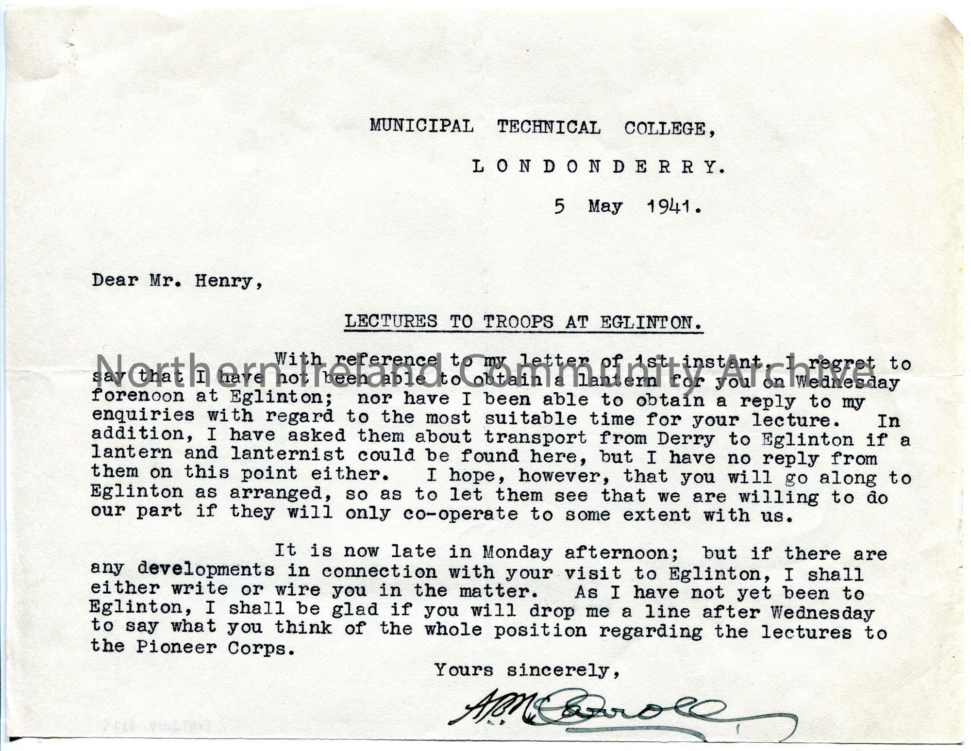 Typed letter to Sam Henry re lectures to troops at Eglinton. Writes that they have had no communication from Eglinton re the lecture on Wednesday [7th May]. Sam to continue to Eglinton anyway.