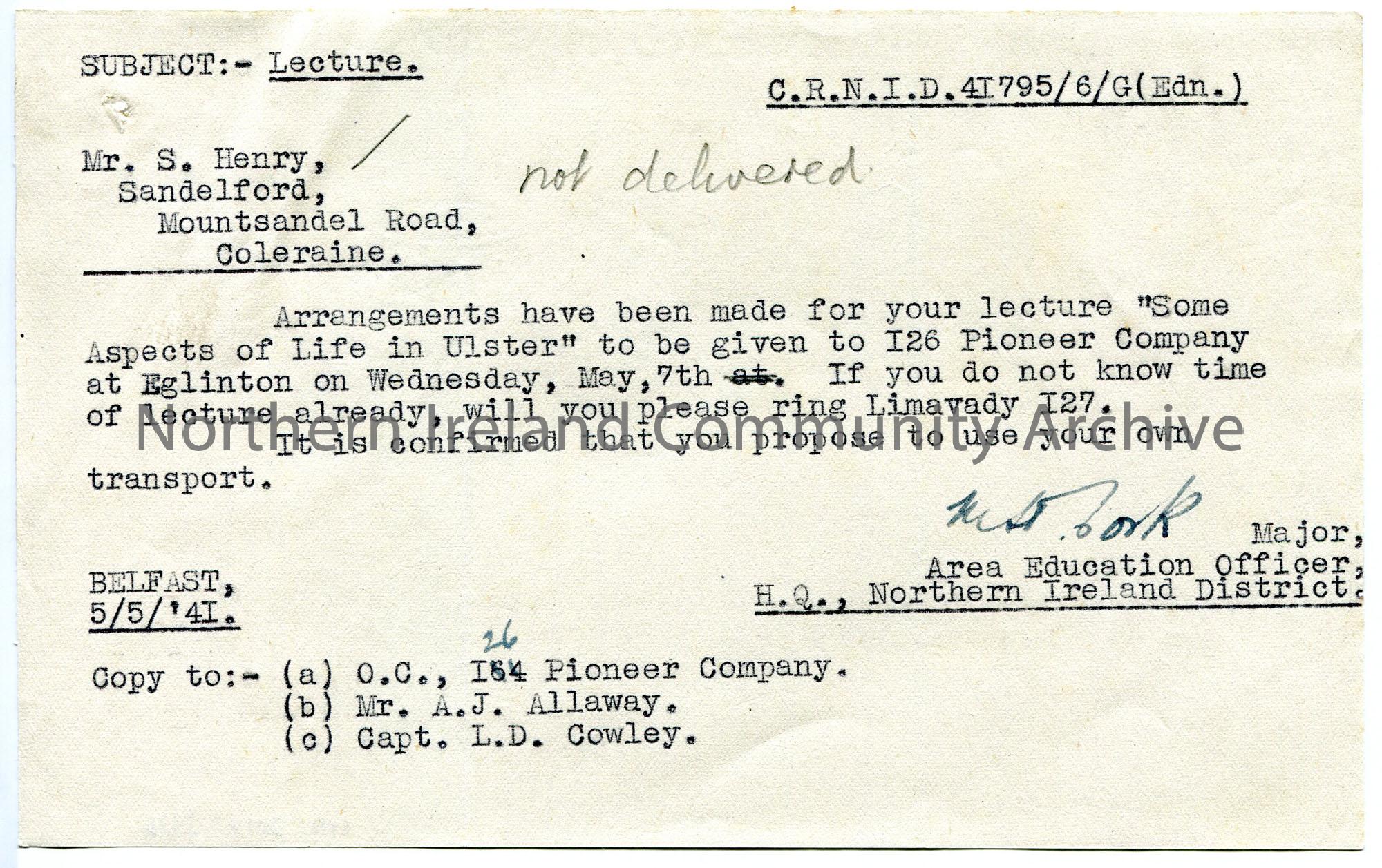 Typed letter to Sam Henry re lectures to troops. Confirmation of arrangements for a lecture by Sam 'Some Aspects of Life in Ulster' to be given to 126 Pioneer Company at Eglinton on 7th May 1941. 'not delivered' handwritten in pencil on letter.