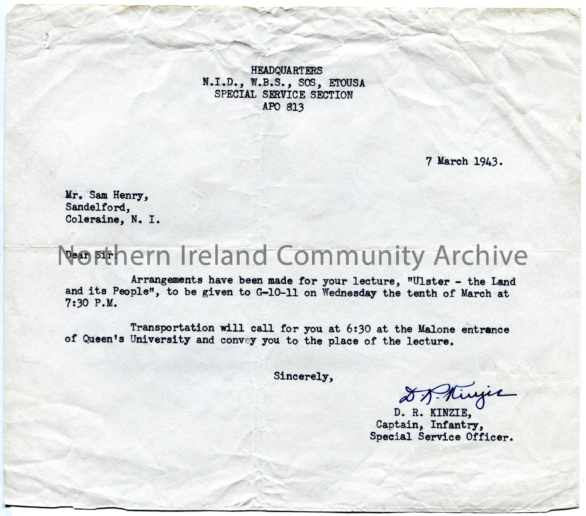 Typed letter to Sam Henry re lectures to troops. Confirmation of lecture and travel arrangements on 10th March 1943 to G-10-11 [US forces] in the Belfast area at 7.30pm.