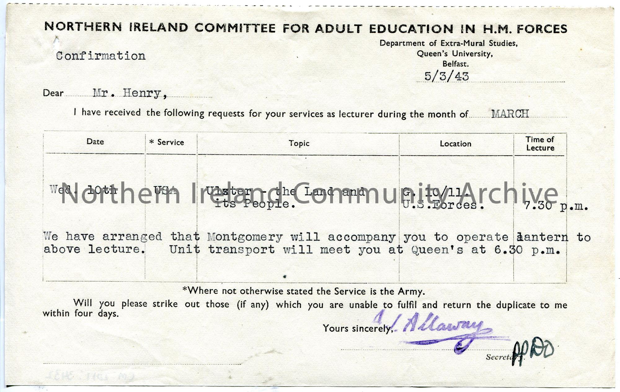 Typed letter to Sam Henry re lectures to troops. Confirmation of lecture by Sam on 10th March on 'Ulster - The Land and its People' given to U.S. Forces at G. 10/11. Probably in Belfast area as transport arrangements state that transport will meet Sam at Queen's [University, Belfast].
