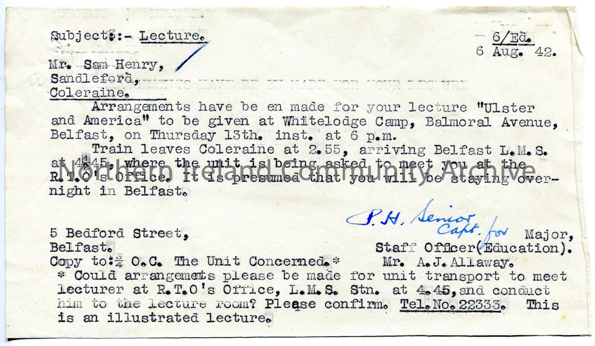 Typed letter to Sam Henry re lectures to troops. Confirming arrangements for Sam's lecture 'Ulster and America' at Whitelodge Camp, Balmoral Avenue, Belfast for 13th August 1942. Confirms transport for Sam via train. [Lecture later cancelled].