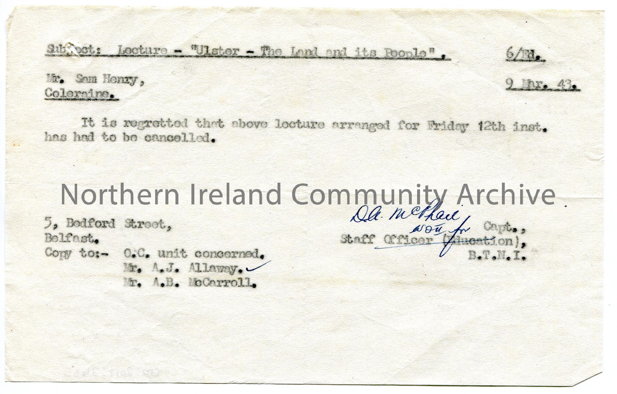 Typed letter to Sam Henry re lectures to troops. Informing Sam that lecture ‘Ulster – The Land and its People’ on 12th March 1943 has been cancelled. …