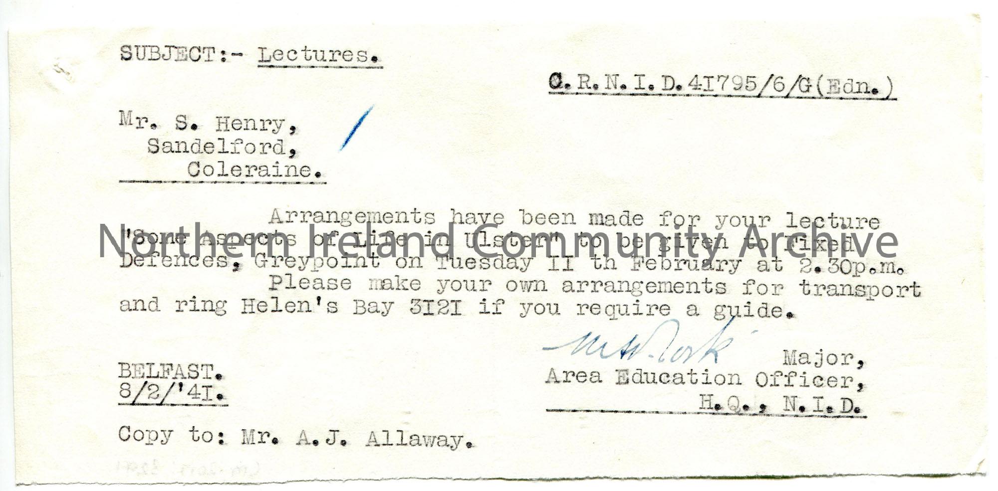 Typed letter to Sam Henry re lectures to troops. Informs Sam his lecture 'Some Aspects of Life in Ulster' is to be given to Fixed Defences, at Greypoint on 11th February. Sam to make his own travel arrangements and ring Helen's Bay 3121 if a guide is needed.