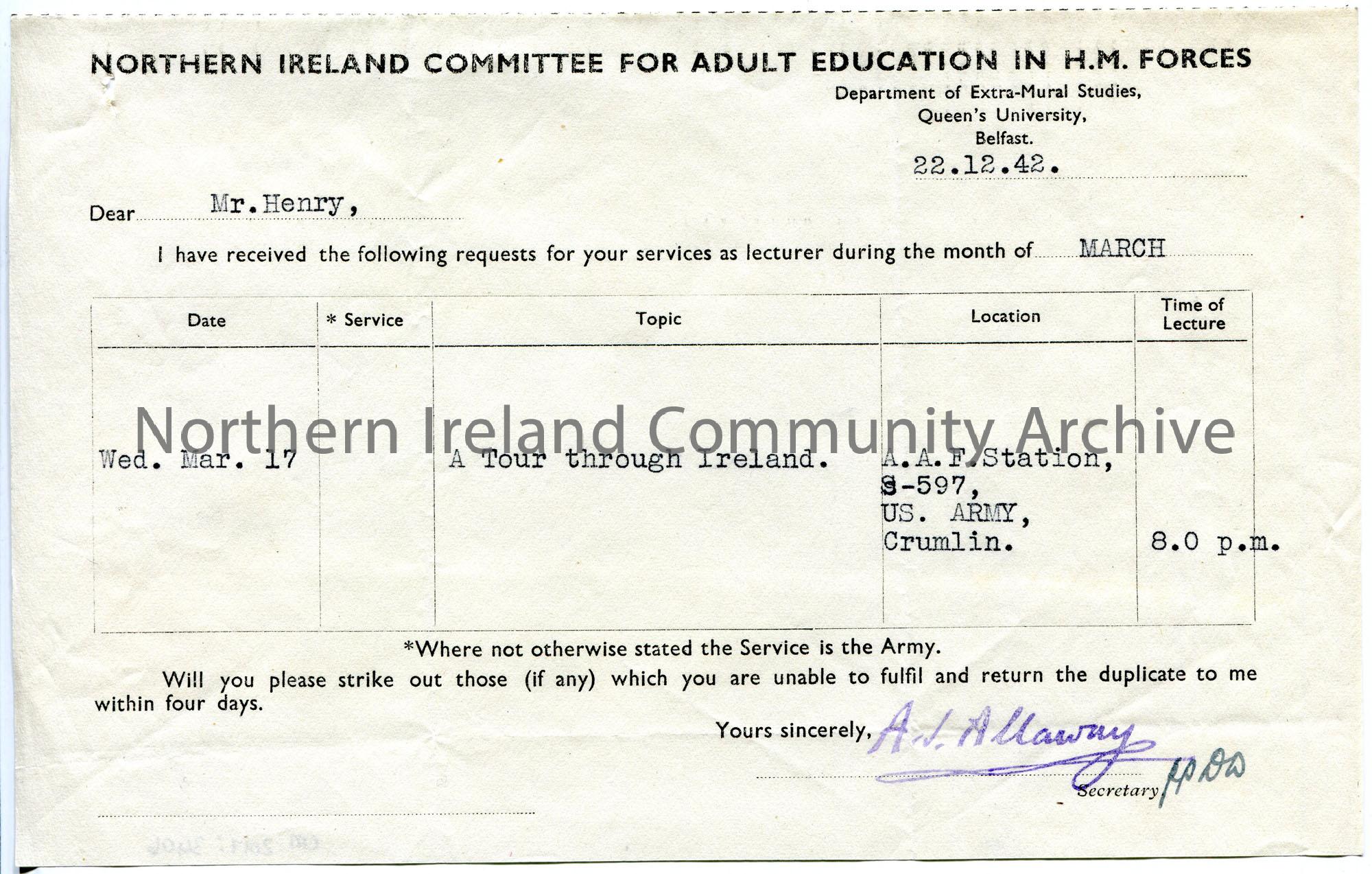Typed letter to Sam Henry re lectures to troops. Proposes lecture on 17th March 1943 on 'A Tour through Ireland' to A.A.F. Station, S-597, U.S. Army, Crumlin.