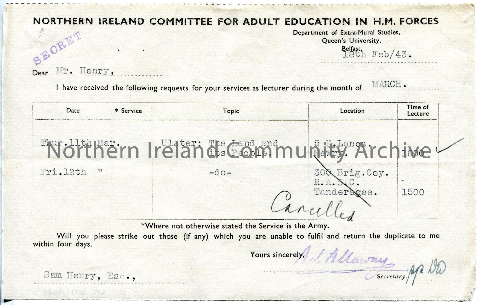 Typed letter to Sam Henry re lectures to troops. Proposes lectures for the month of March. 11th March 1943 at Newry to 5 E.Lancs on 'Ulster - The Land and its People'. Lecture proposed for 12th March 1943 in Tanderagee is scored out as cancelled. Stamped as 'SECRET'.
