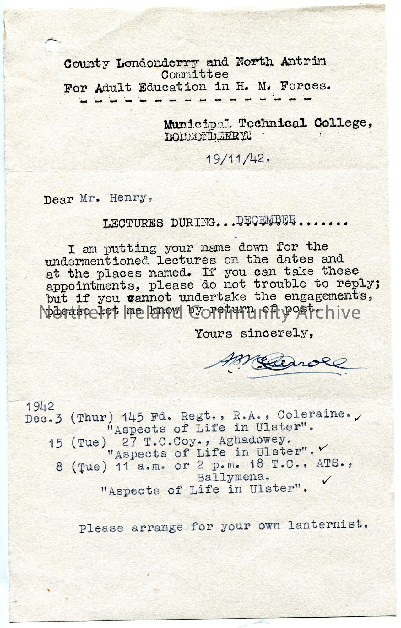 Typed letter to Sam Henry re lectures to troops. Suggestion of lectures and dates for Sam for the month of December. Locations stated as Coleraine, Ag…