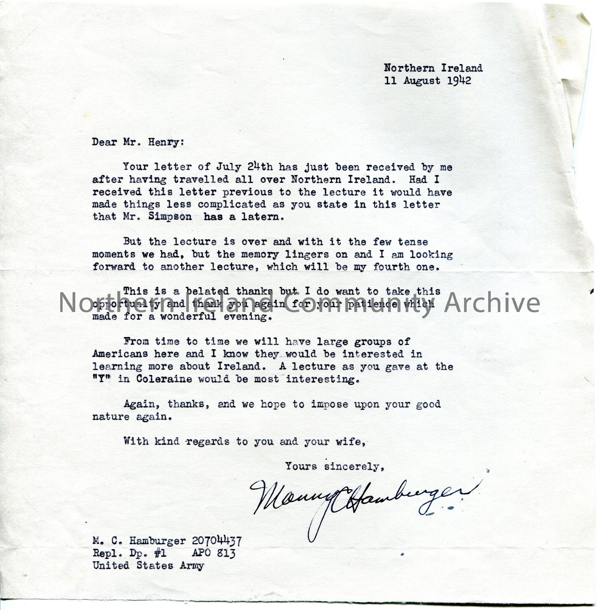 Typed letter to Sam Henry re lectures to troops. Thanks Sam for giving his lecture. Tells Sam that another lecture which he gave at the 'Y' in Coleraine would be 'interesting'.