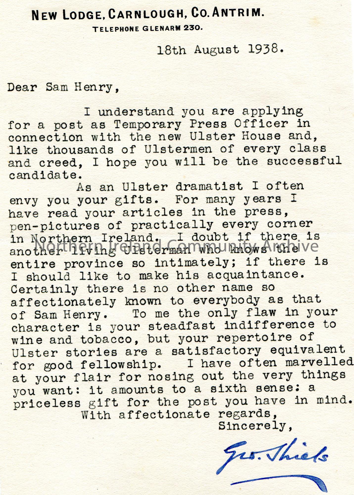 Typed letter to Sam Henry. Re testimonial for a post Sam is applying for as Temporary Press Officer at New Ulster House. Speaks highly of Sam’s abilit…
