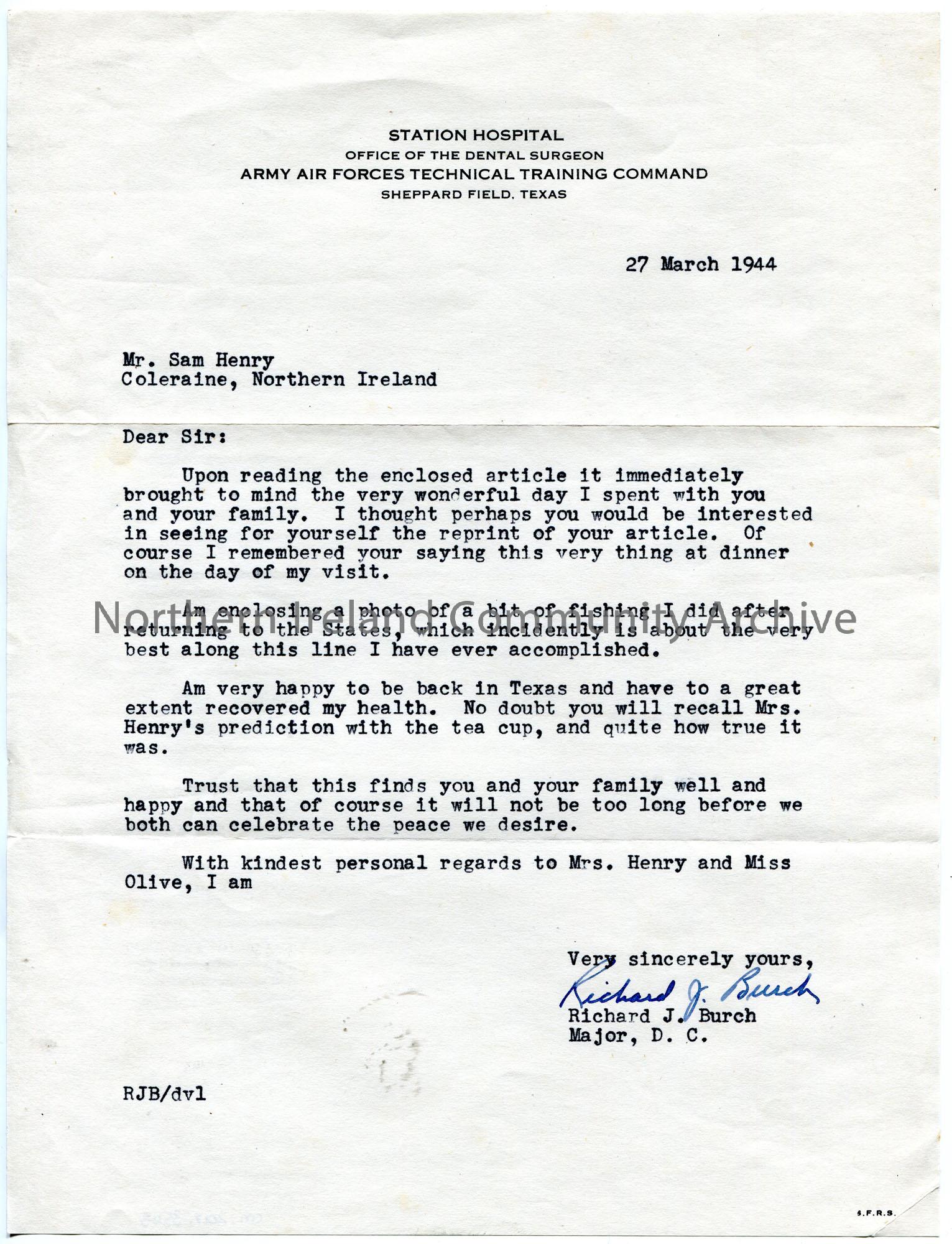 Typed letter to Sam Henry. Remembers a day spent with Sam and his family. Encloses a photograph of himself fishing in America. Gives his wishes to Sam, Maimie and Olive.