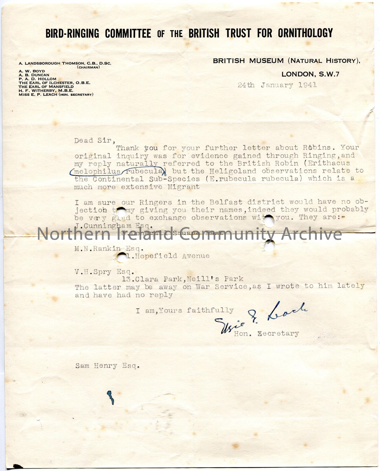 Typed letter to Sam Henry. Replying to Sam's enquiry re evidence gained through Ringing with reference to the Robin. Provides Sam with a list of 3 Ringers in the Belfast area - J. Cunningham, M. N. Rankin and V. H. Spry.