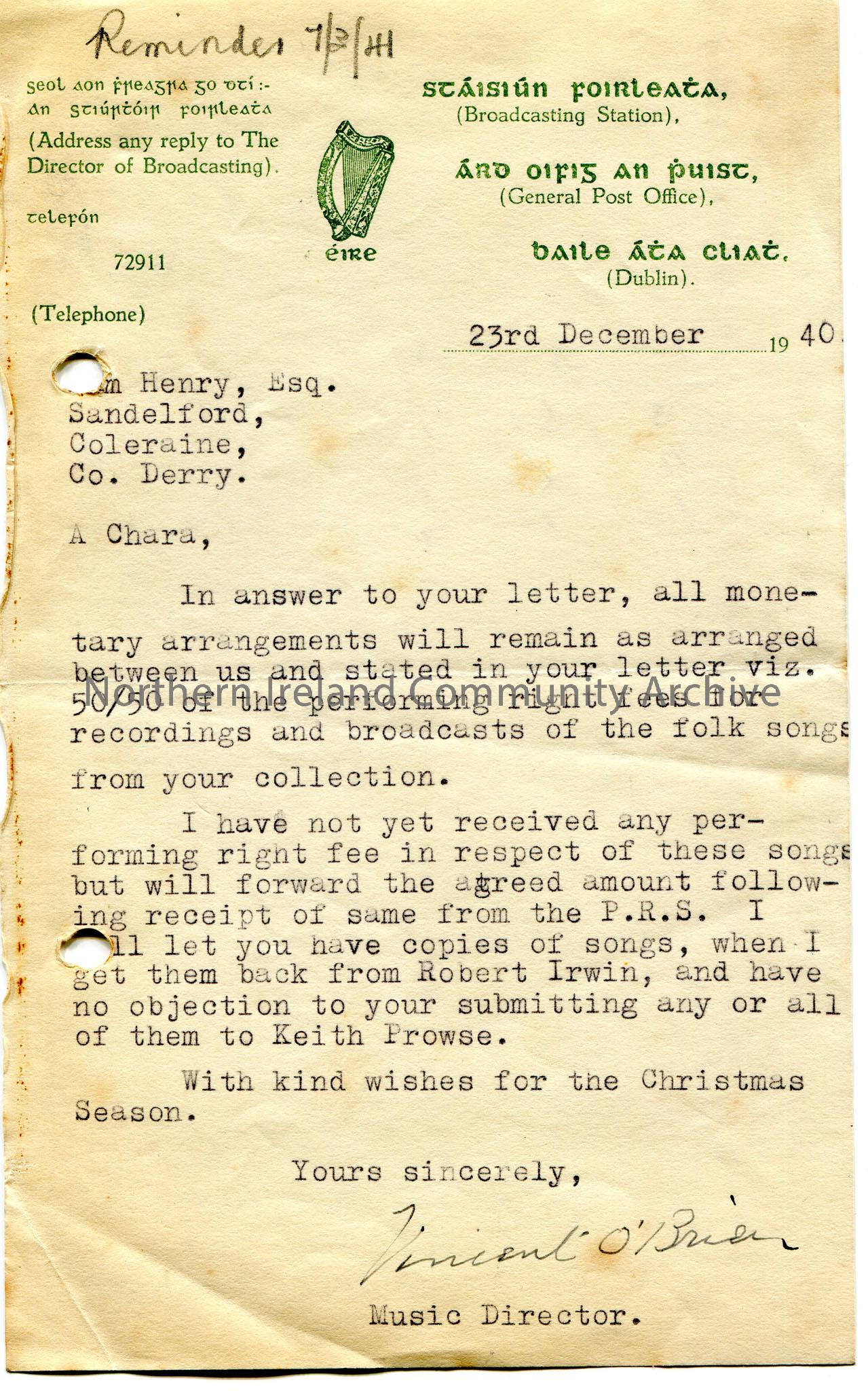 Typed letter to Sam Henry, Sandelford, Coleraine, Co. Derry. 'Reminder 7/3/41' handwritten in pencil at top of page. Numerical calculation on back of page. Writing re arrangements for performing fees. To give Sam copies of songs when he gets them back from Robert Irwin and Sam may submit them to Keith Prowse.