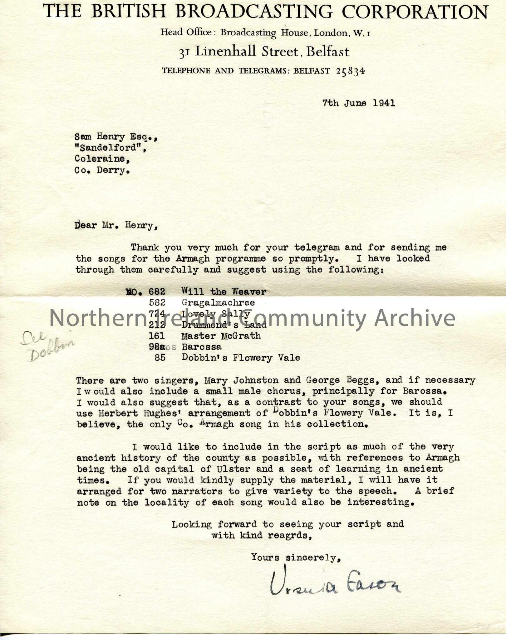 Typed letter to Sam Henry, Sandelford, Coleraine, Co. Derry. Thanks Sam for the telegram. Lists the songs to be used in the Armagh programme. Singers are to be Mary Johnston and George Beggs. Mentions Herbert Hughes' arrangement of 'Dobbin's Flowery Vale'. Script to contain as much ancient history of Armagh as possible and notes of the locality of each song.