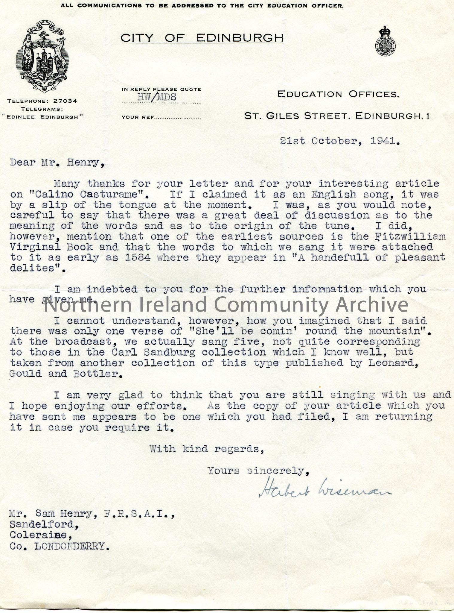 Typed letter to Sam Henry, Sandelford, Coleraine, Co. Londonderry, on headed paper. Thanks Sam for his letter and article on 'Calino Casturame'. Writes of the song origin. Discusses a misunderstanding of the number of verses to 'She'll be comin' round the mountain'. Mentions the Carl Sandburg collection.