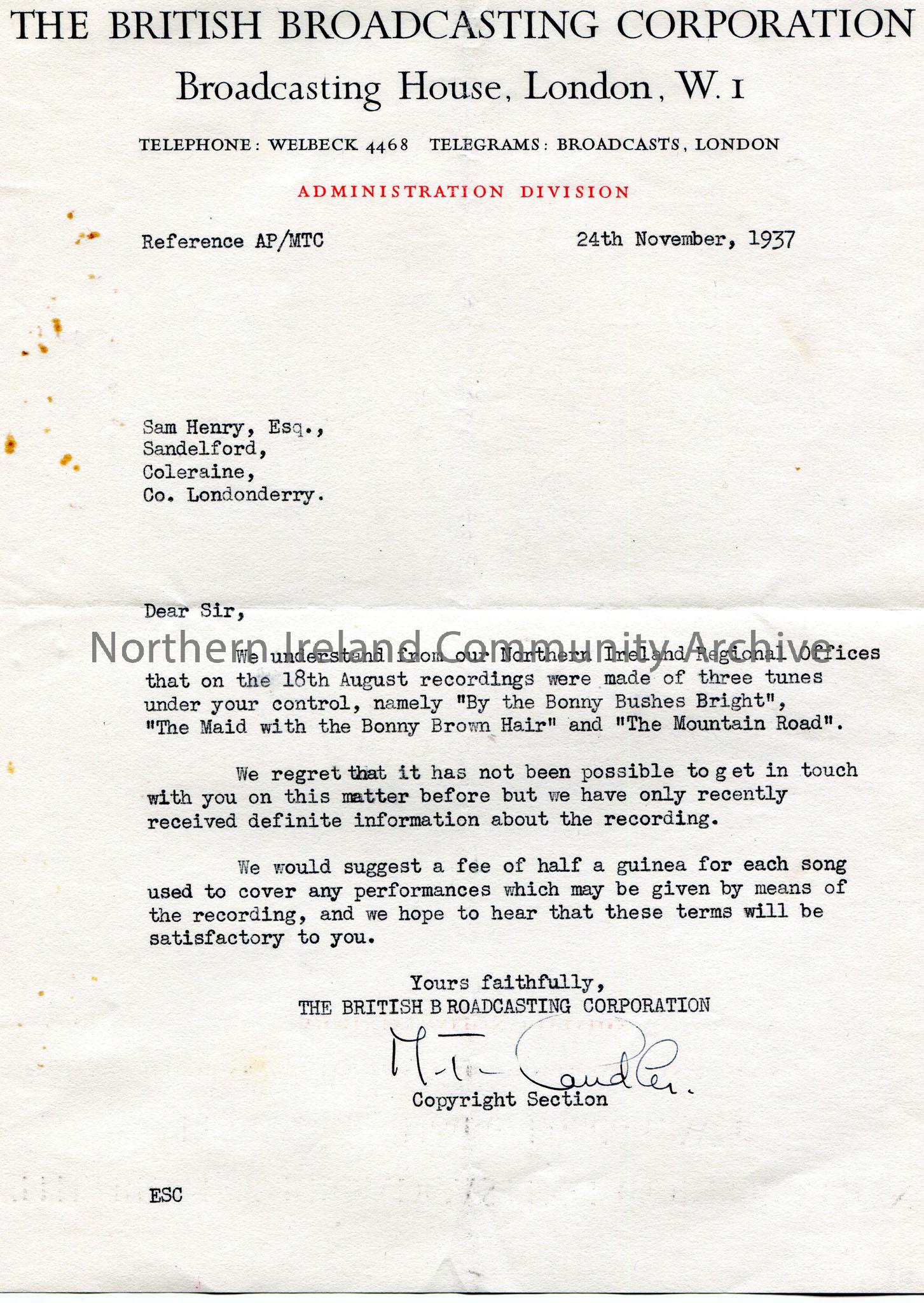 Typed letter to Sam Henry, Sandelford, Coleraine, Co.Derry. Informing Sam the need to pay a fee for songs 'By the Bonny Bushes Bright', 'The Maid with the Bonny Brown Hair' and 'The Mountain Road' if performed in any recording.