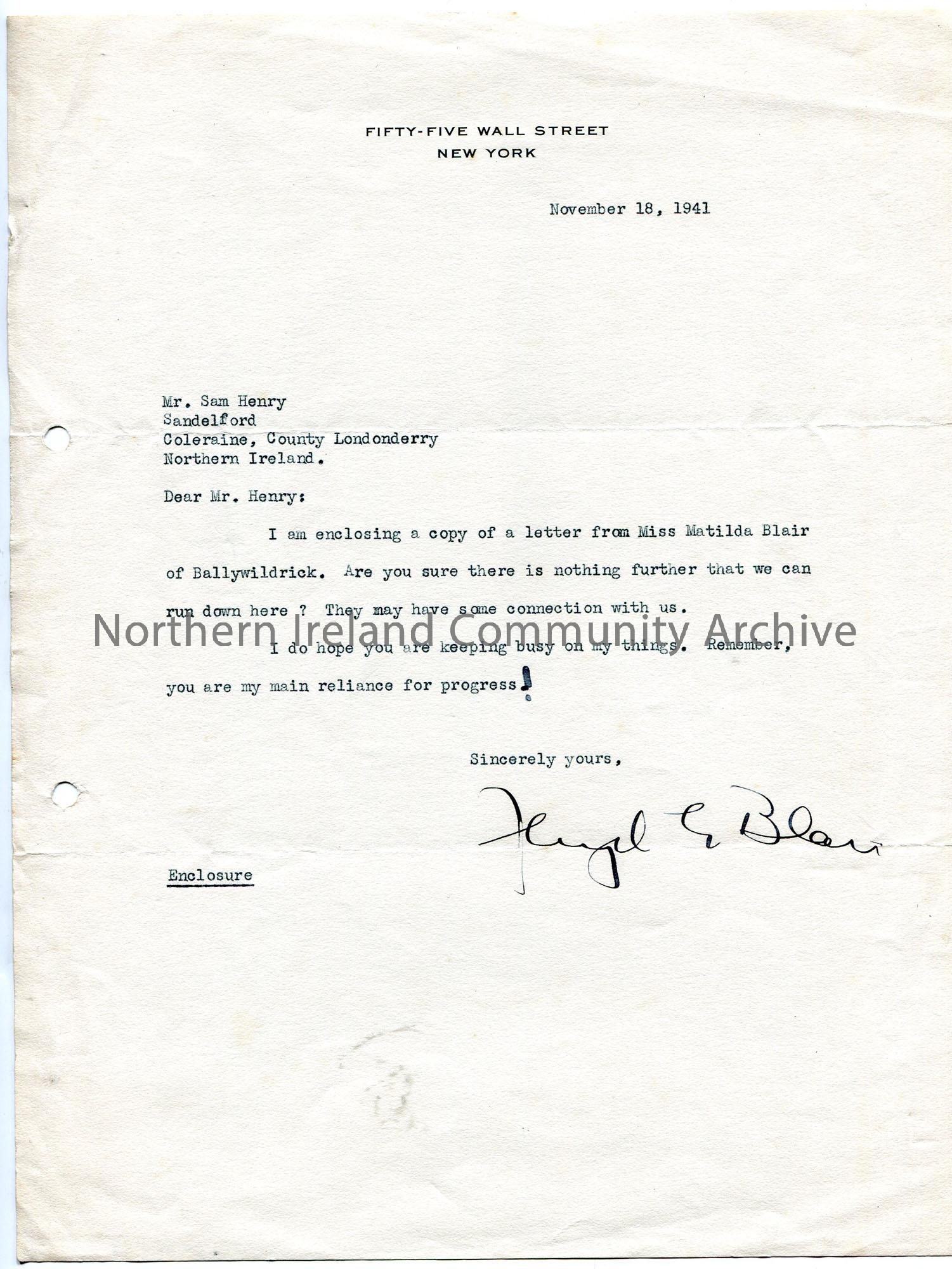 Typed letter to Sam Henry, Sandelford, Coleraine, County Londonderry. Encloses letter from Miss Matilda Blair of Ballywildrick. Hopes that Sam is 'keeping busy on my things and that he is his 'main reliance for progress!'