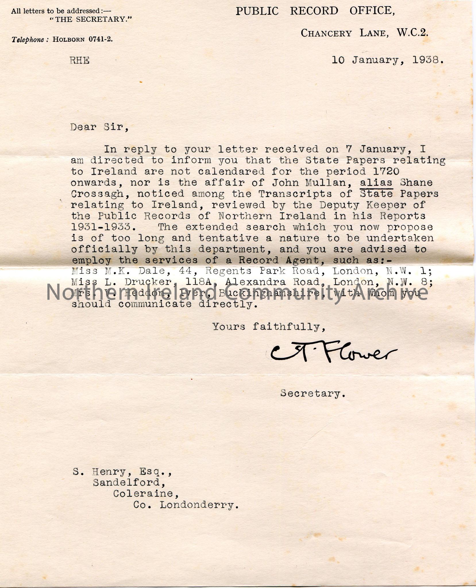 Typed letter to Sam Henry, Sandelford, Coleraine. Dated 10th January, 1938. Writing re the search for information on Shane Crossagh in the State Papers relating to Ireland. Advised that the search is too long and tentative for the Public Record Office. Suggests 3 other Record Agents - Miss M.K. Dale, Miss L. Drucker and Mrs V. Heddon. Initials S.H handwritten on back of letter.