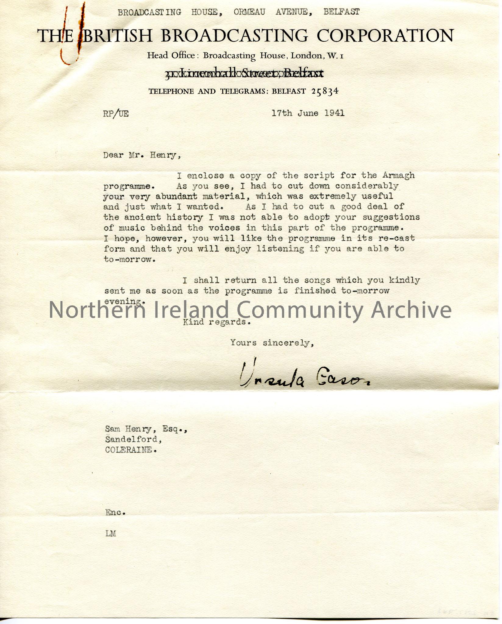 Typed letter to Sam Henry, Sandelford, Coleraine. Encloses copy of script re Armagh programme. Informs Sam that she has amended the script and had to cut it down considerably. To return the songs after tomorrow evening.