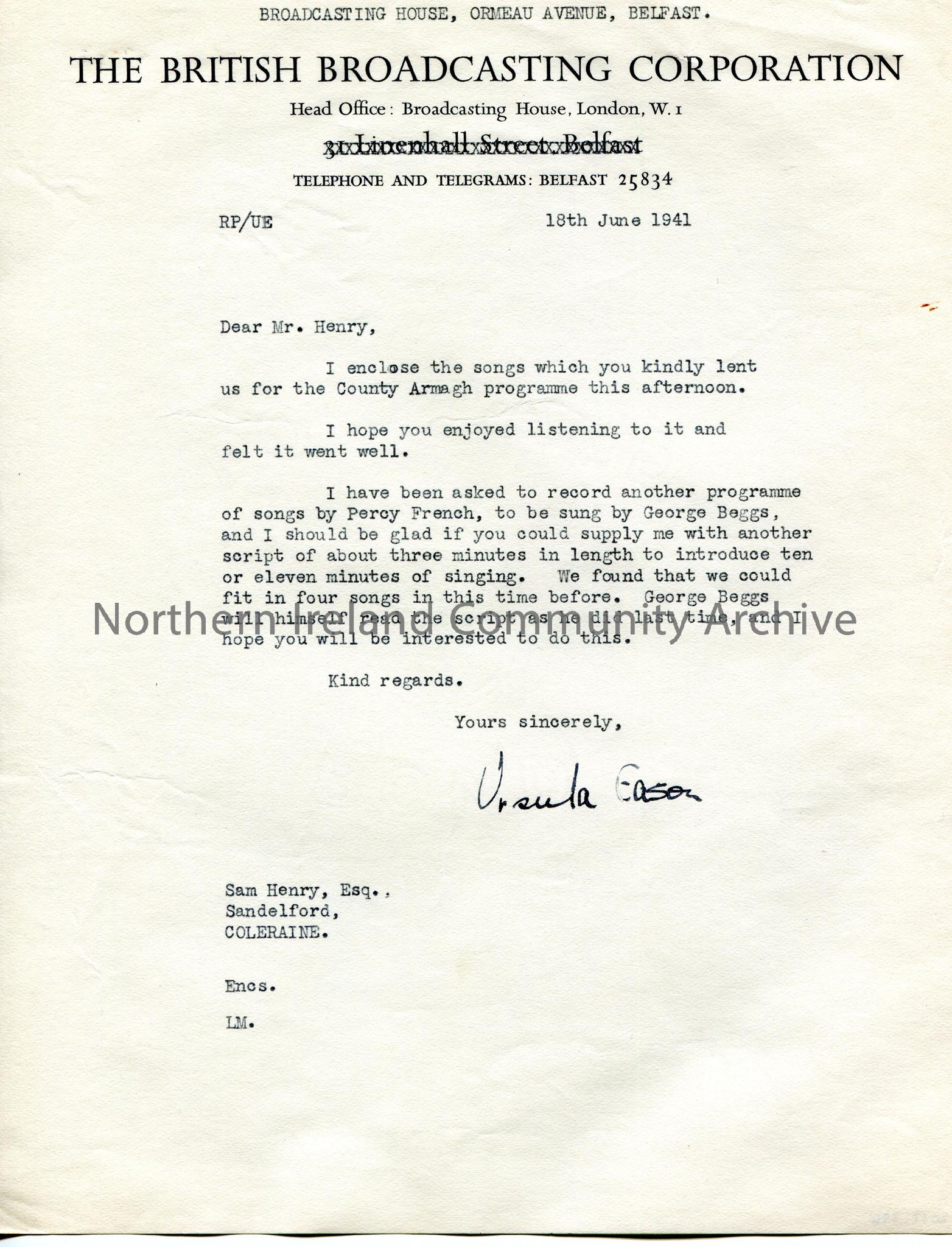 Typed letter to Sam Henry, Sandelford, Coleraine. Encloses songs re the County Armagh programme in the afternoon. Asks Sam for a script for another Percy French programme.