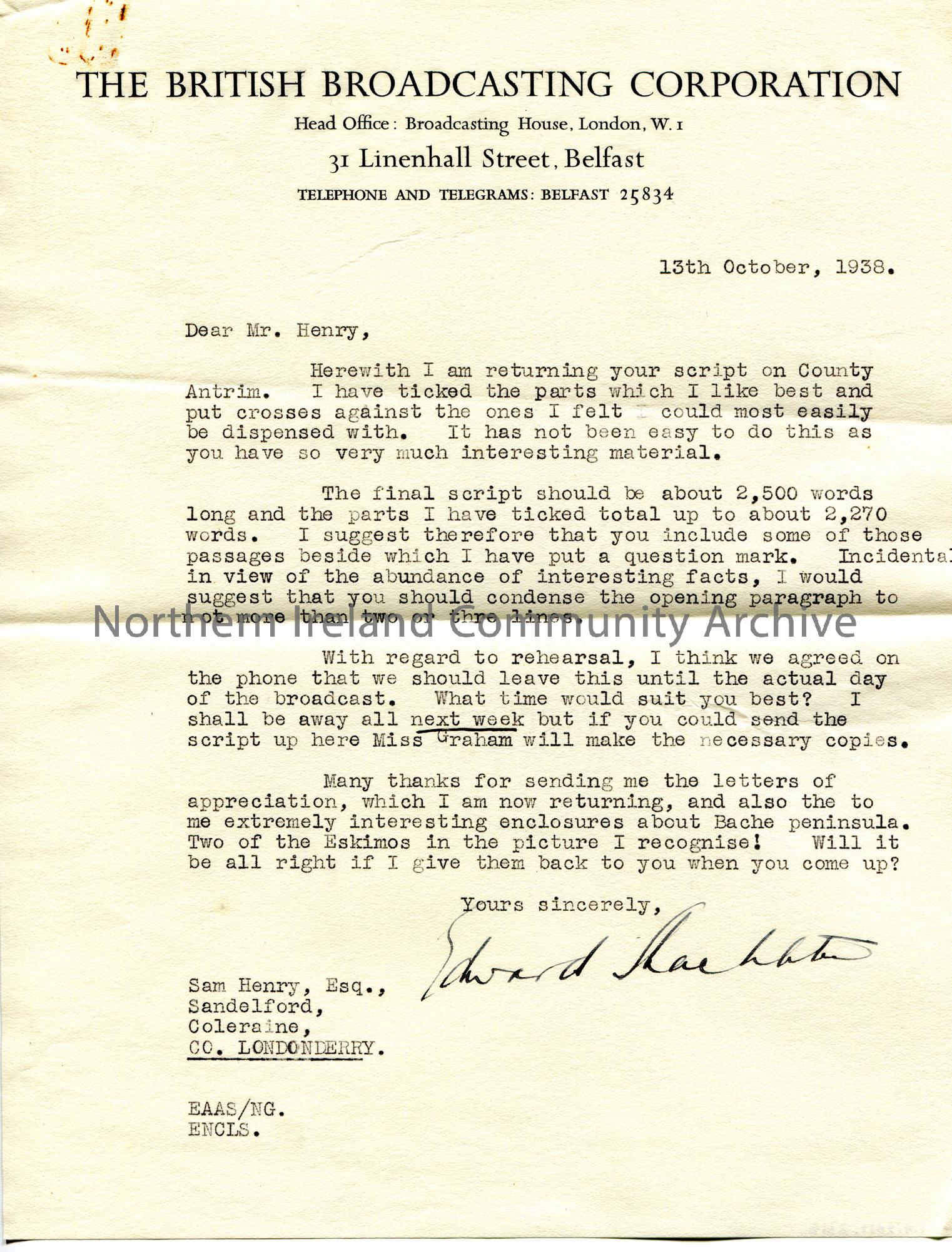 Typed letter to Sam Henry, Sandelford, Coleraine. Returning Sam's script with amendments re County Antrim. Makes recommendations as to the length of the script. Makes plans for a rehearsal on the day of broadcast. Thanks Sam for sending enclosures re Bache peninsula.