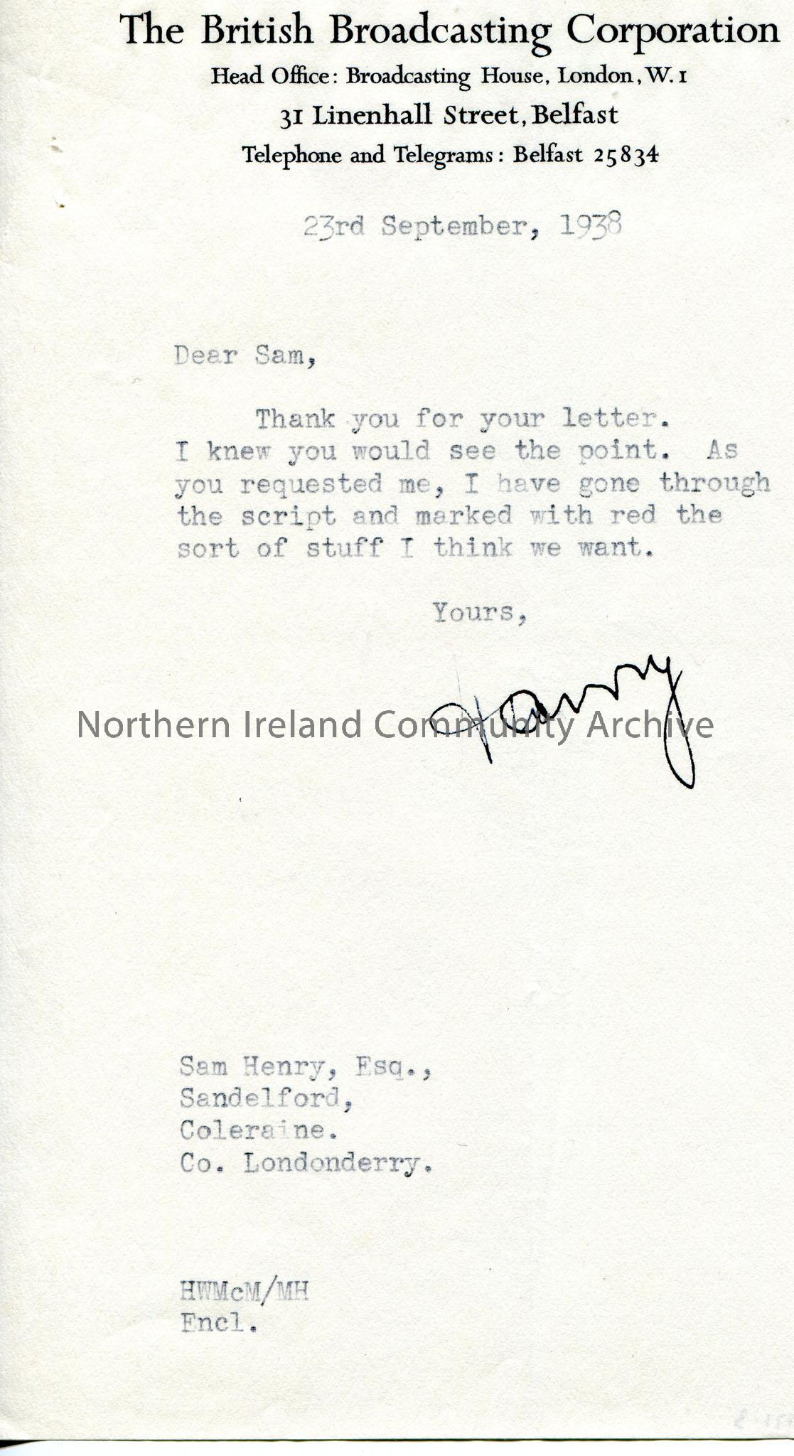Typed letter to Sam Henry, Sandelford, Coleraine. Thanks Sam for his letter. Informs Sam that they have marked the script for broadcast in red 'of stuff I think we want.'