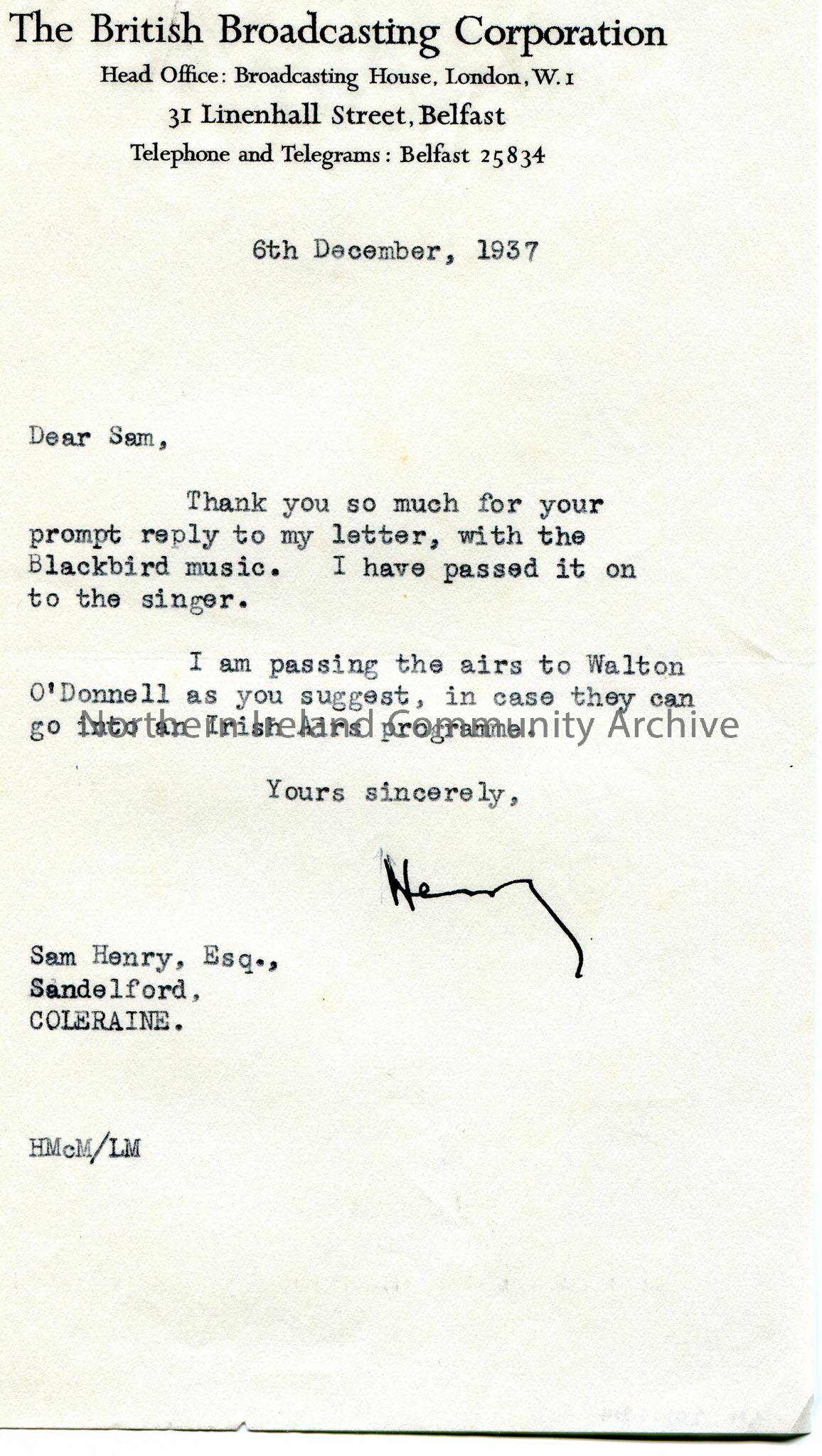 Typed letter to Sam Henry, Sandelford, Coleraine. Thanks Sam for sending the Blackbird music. Will pass the airs to Walton O'Donnell in case they are used in an Irish Airs Programme.