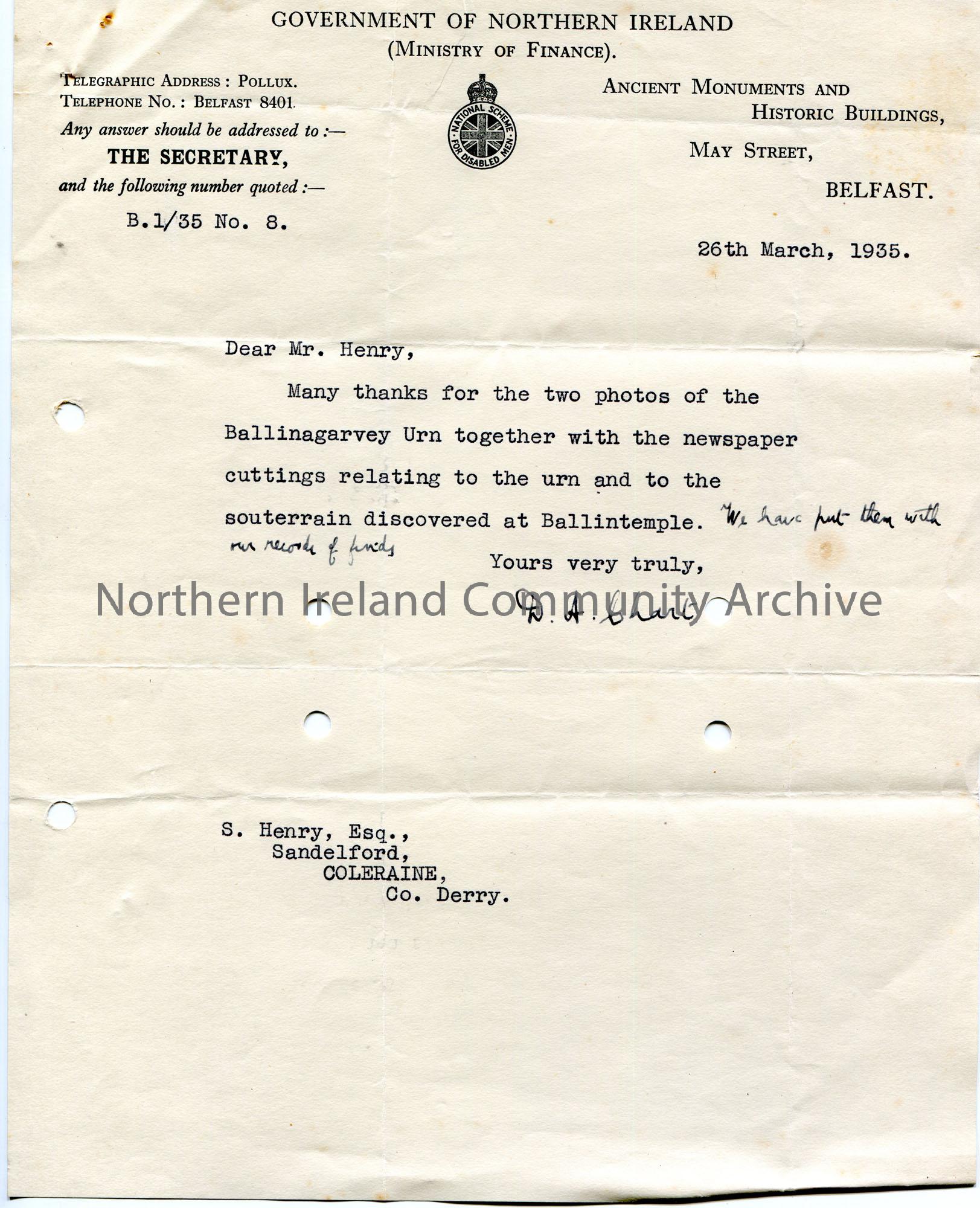Typed letter to Sam Henry, Sandelford, Coleraine. Thanks Sam for sending two photographs of the Ballinagarvey Urn and newspaper cuttings re the Urn and a souterrain discovered at Ballintemple. All of which they have put in their records of finds.