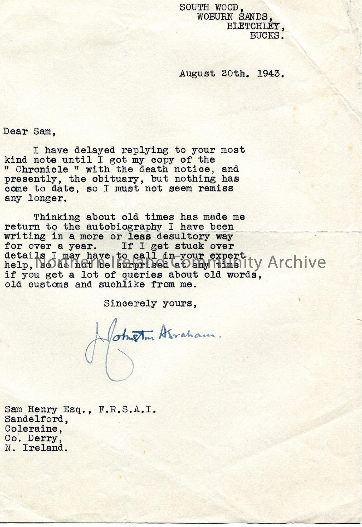 Typed letter to Sam Henry, Sandelford, Coleraine. Writing re a death notice and obituary in the 'Chronicle' newspaper. May seek help from Sam re his autobiography.