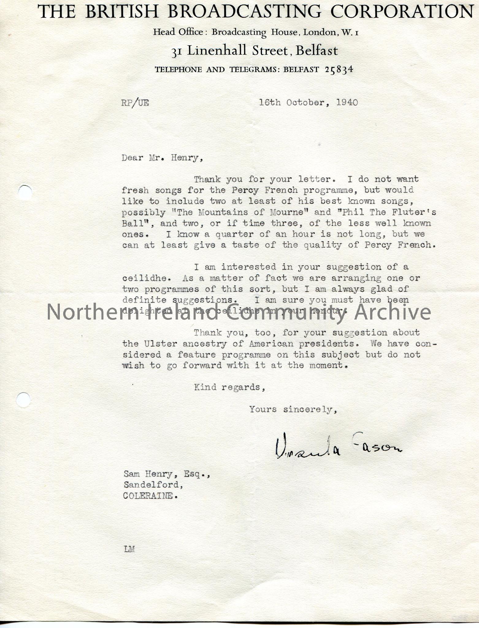 Typed letter to Sam Henry, Sandelford, Coleraine. Writing re Percy French talk for BBC North America Programme. Would like to include the songs 'The Mountains of Mourne' and 'Phil The Fluter's Ball' in the script. Writes on the suggestion of a ceilidhe. Does not currently wish to proceed re Ulster ancestory of American presidents.