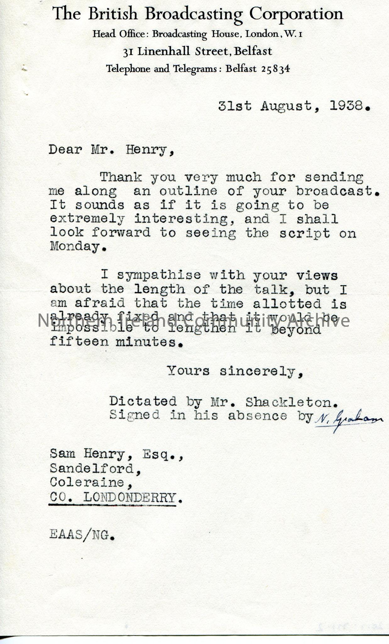 Typed letter to Sam Henry, Sandelford, Coleraine. Writing re script for broadcast which Sam has written. Informs Sam the talk cannot be more than 15 minutes.