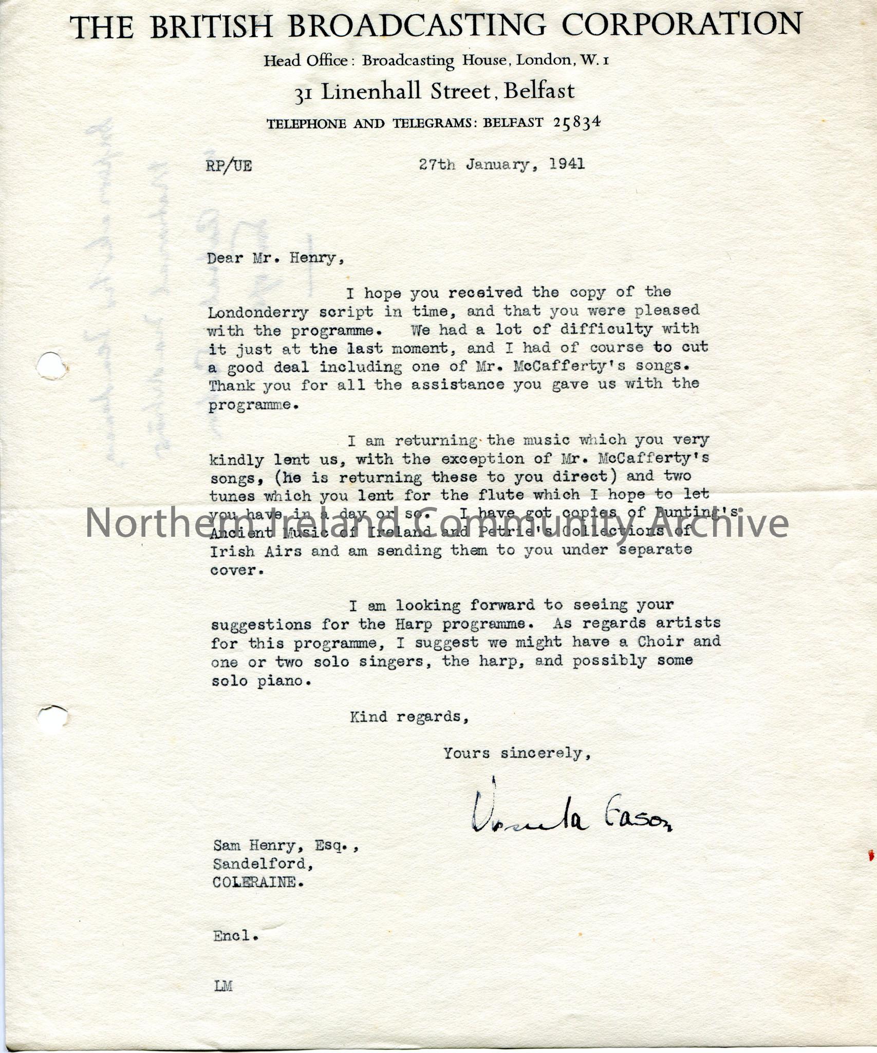 Typed letter to Sam Henry, Sandelford, Coleraine. Writing re the 'Music in Derry' broadcast. Writes that there was difficulty with the script at the last moment and had to cut a lot out including one of Mr McCafferty's songs. Forwarding copies of Bunting's Ancient Music of Ireland and Petrie's Collections of Irish Airs to Sam. Mentions a Harp programme for broadcast. Handwritten note in pencil on back of page 'Imperial... ? National Auditions? in Central Europe.'
