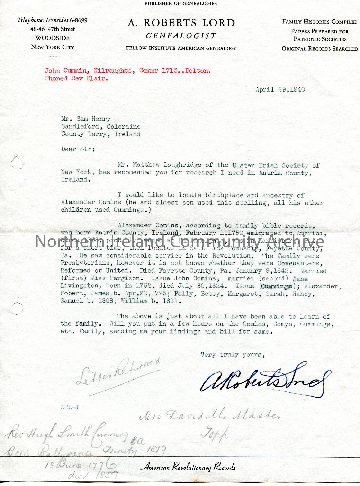 Typed letter to Sam Henry, Sandleford [Sandelford], Coleraine. Typed in red at top of page 'Replied....4th June 1940. Sent Q' and 'John Cummin, Kilraughts, Commr 1715..Bolton. Phoned Rev Blair'. Handwritten in pencil at bottom of page, 'Letter Returned' and re Mrs David McMaster, Rev Hugh Smith Cunning. Mr Matthew Loughridge of the Ulster Irish Society of New York recommended Sam to help with research in County Antrim. They are looking to locate the birthplace and ancestry of Alexander Comins [Cummings]. Includes genealogical information re Alexander Comins. Asks Sam to send a bill for findings.