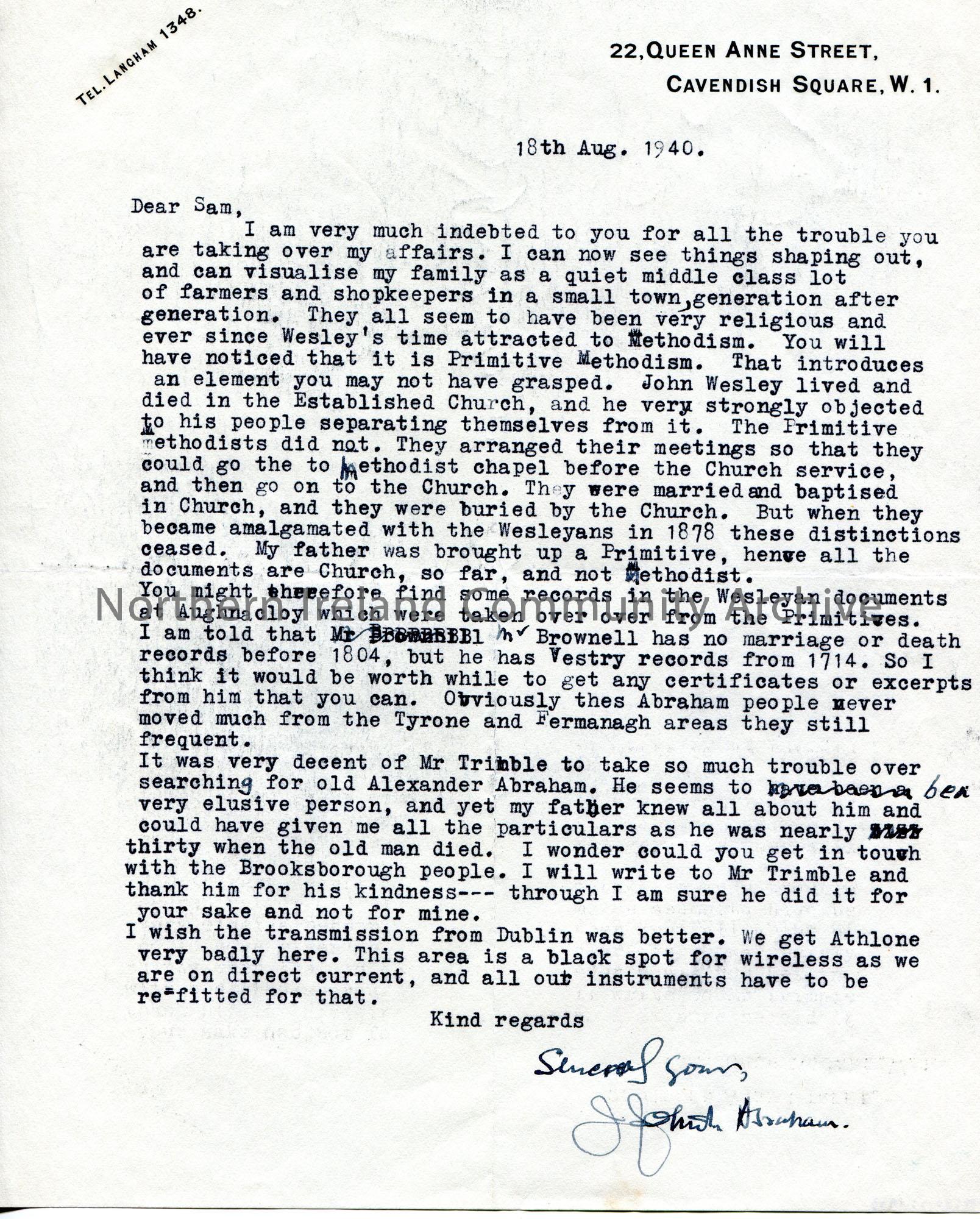 Typed letter to Sam Henry. Thanks Sam for his efforts in helping him find out more about his family. Writes about his family's religion as Primitive Methodists. Thanks Mr Trimble for his trouble in searching also. Wishes the reception from Dublin was better to hear Sam's broadcasts.