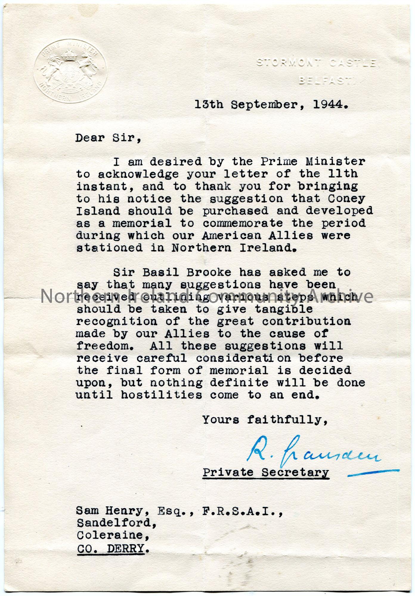 Typed letter to Sam Henry. Thanks Sam for his letter to the Prime Minister re the proposed dedication of Coney Island to American Allies who were stationed in NI. They were informed by Sir Basil Brooke that there were various other proposals which will have to be included in the decision.
