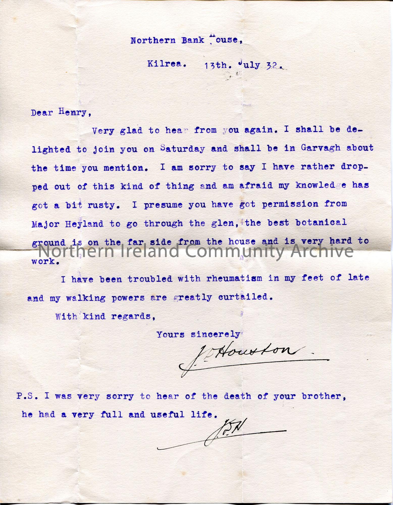 Typed letter to Sam Henry. They are delighted to be meeting Sam. Sam appears to have queried something with them. Talks about Sam gaining permission from Major Heyland 'to go through the glen'. indicating the best botanical ground. Gives sympathies on death of Sam's brother William, Town Clerk of Coleraine.