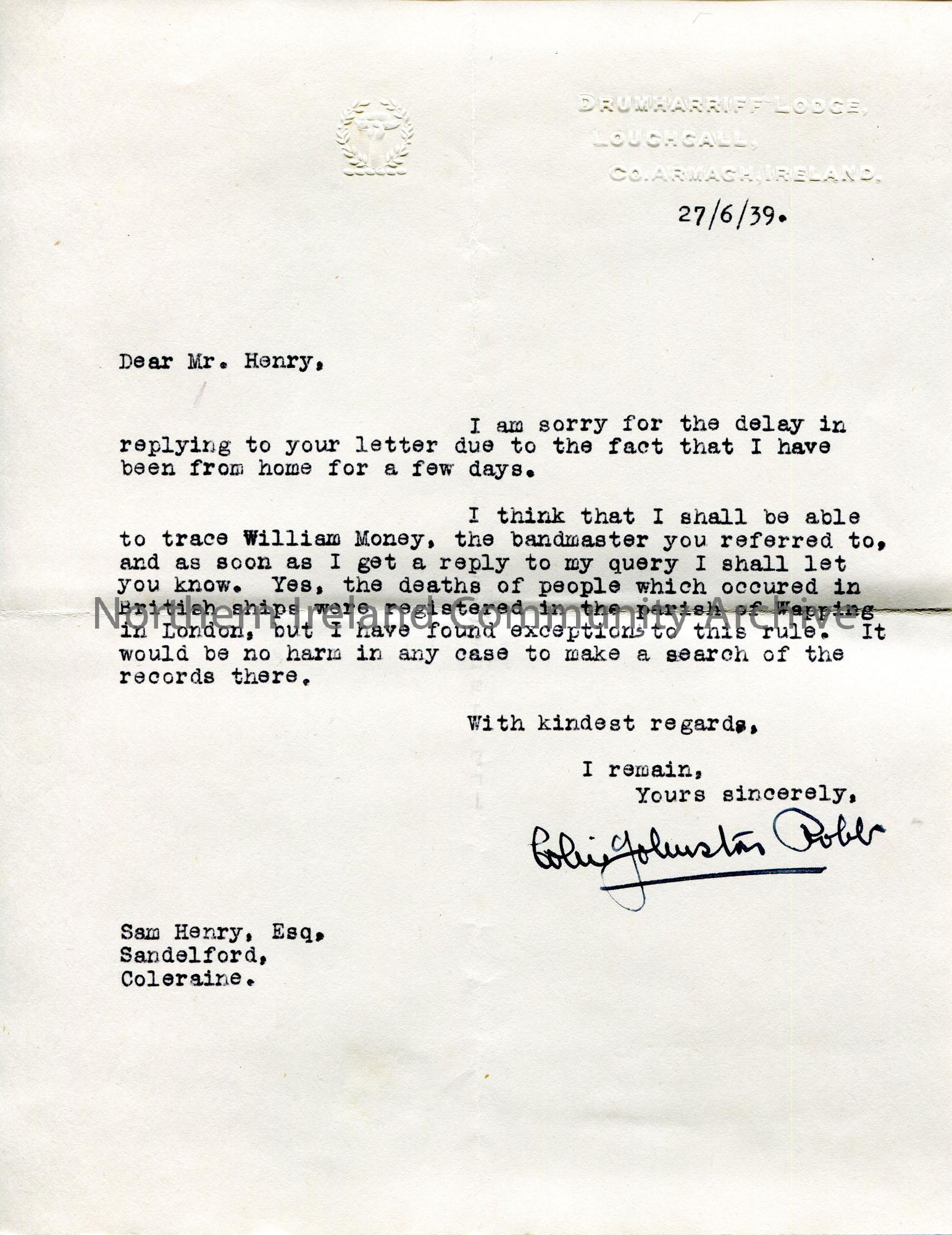 Typed letter to Sam Henry. Thinks they may be able to trace William Money, bandmaster, for Sam. Suggests doing a record search in the parish of Wapping, London.