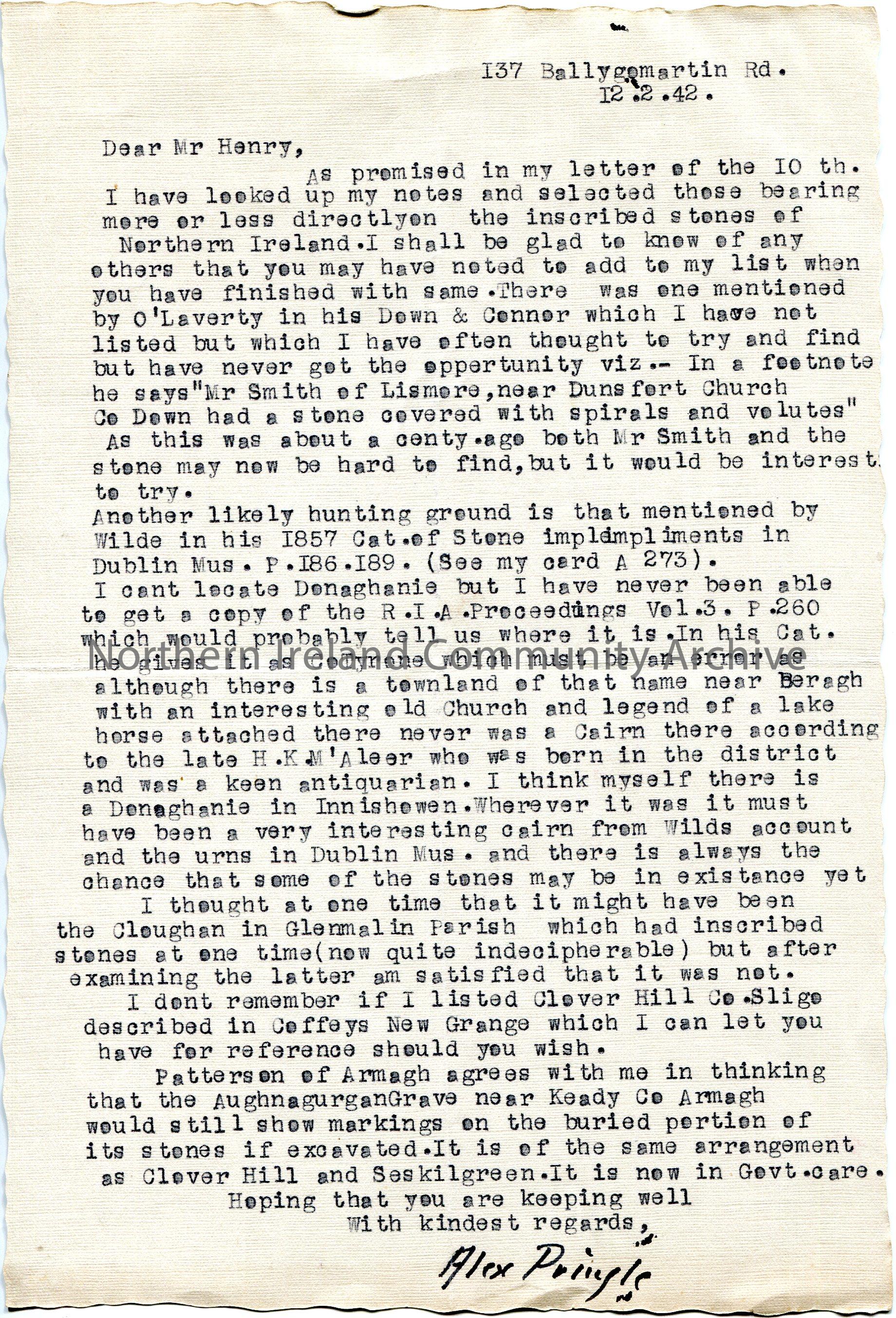 Typed letter to Sam Henry. Writing in response to queries from Sam re spiral and cup markings on stone. Had looked up a list of inscribed stones in Northern Ireland for Sam. Mentions a stone covered in spirals and volutes at Lismere, Dunsfort Church, Co Down; urns in Dublin Museum; Clover Hill Co. Sligo and Aughnagurgan Grave, Keady, Co Armagh.