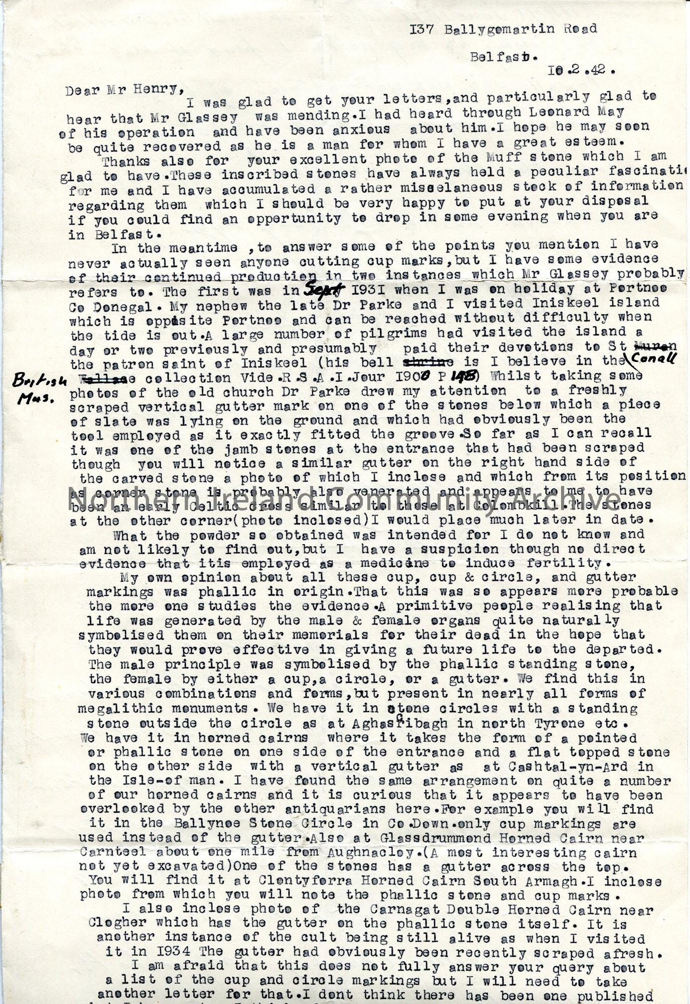 Typed letter to Sam Henry. Writing in response to queries from Sam re spiral and cup markings on stone. They believe in the phallic theory. Mentions Ballynoe Stone Circle, Co Down, Glassdrummond Horned Cairn, Carnteel, Clontyforra Horned Cairn, South Armagh, Carnagat Double Horned Cairn, Clogher. Handwriting on reverse with diagrams.
